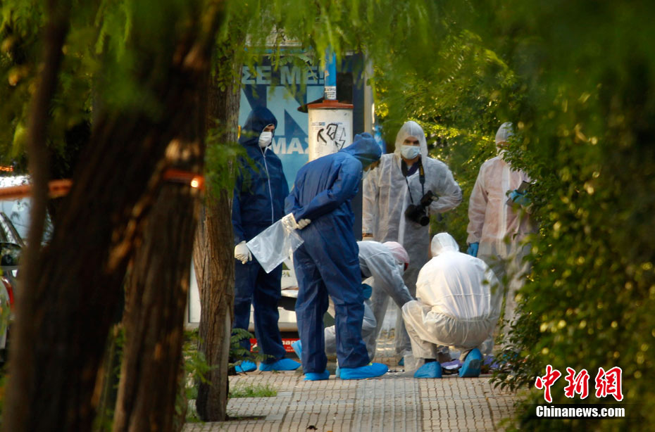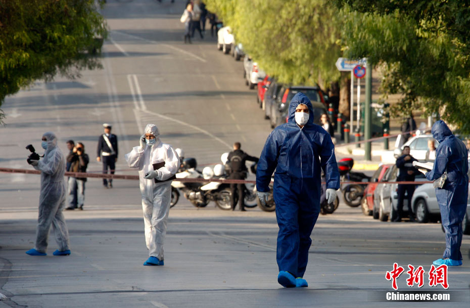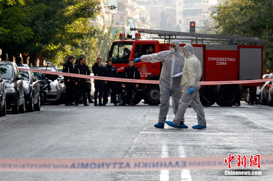 圖為爆炸事件發(fā)生后,希臘警方封鎖了發(fā)生爆炸事件的郵局及周邊地區(qū)。
