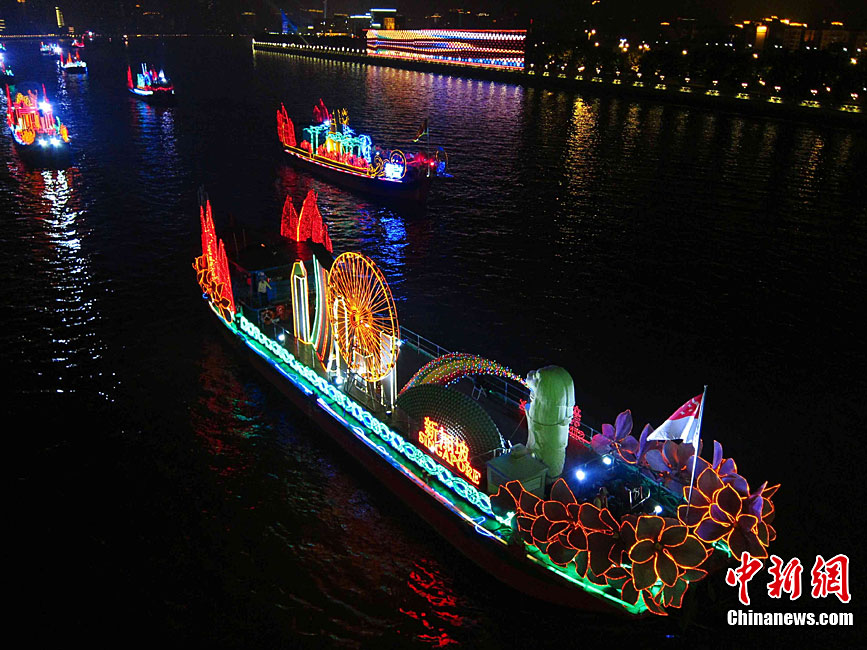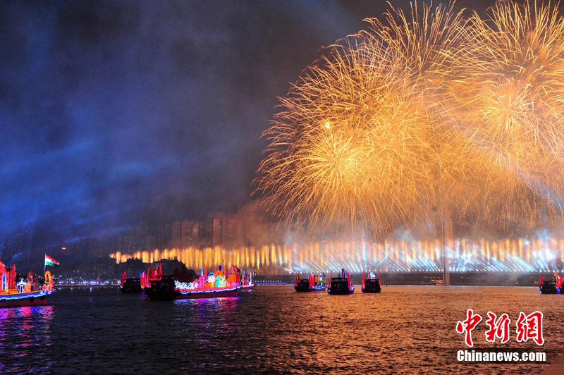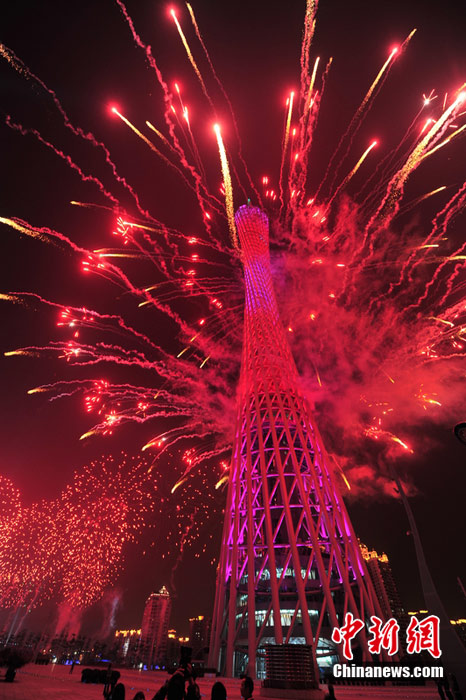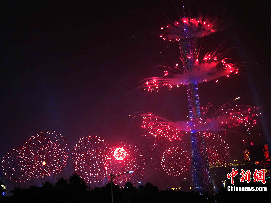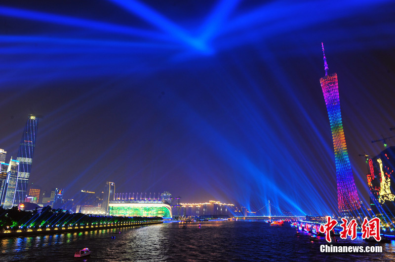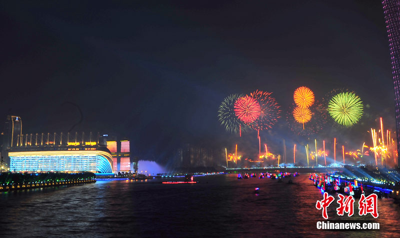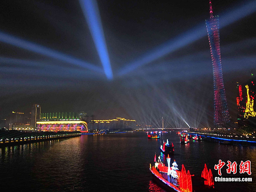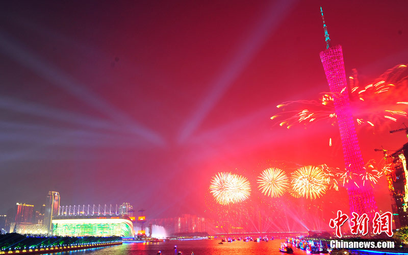 2010年11月3日晚,廣州海心沙上演包括煙花預(yù)演在內(nèi)的亞運(yùn)開幕式帶妝彩排。圖片來(lái)源:CFP視覺中國(guó)