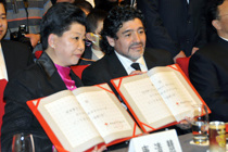 11月4日,馬拉多納溫暖中國(guó)行活動(dòng)進(jìn)行,老馬本人出席了簽約慈善大使的新聞發(fā)布會(huì)。 圖為馬拉多納擁吻小患者。圖片來(lái)源:CFP視覺(jué)中國(guó) 麥田 攝