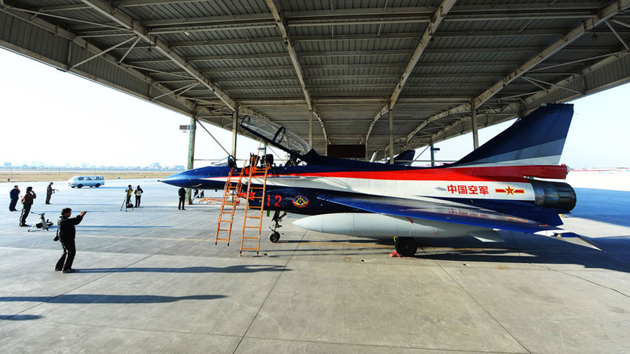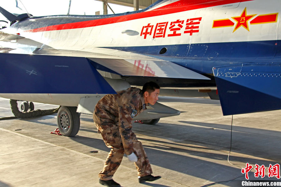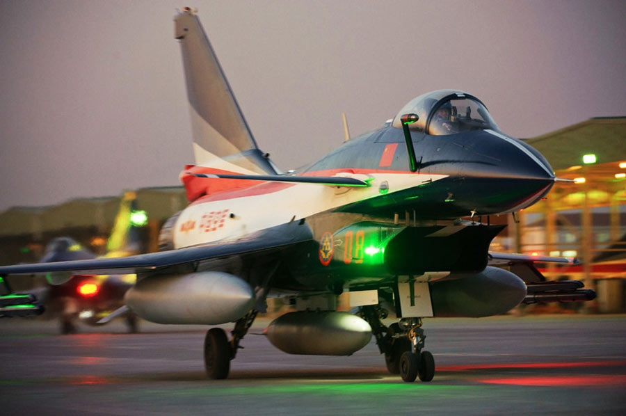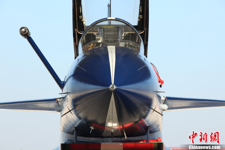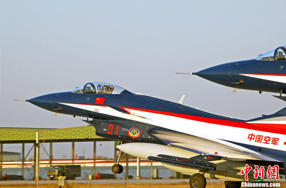 11月初,中國空軍八一飛行表演隊新涂裝的殲10飛機(jī)雙機(jī)起飛?哲姲艘伙w行表演隊7架殲—10戰(zhàn)機(jī)近日將飛赴珠海,參加11月16日至21日舉行的第8屆中國國際航空航天博覽會(珠海航展)。這是表演隊換裝殲—10戰(zhàn)機(jī)后,首次以新涂裝向世人正式亮相?哲娺將派出殲—8F、殲轟—7A、轟—6H、空警—200、直—8KA、直—9WA等7型飛機(jī),參加這次國際性綜合航展。中新社發(fā) 譚超 攝