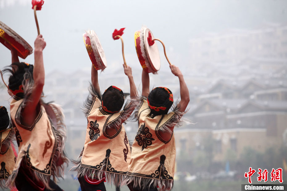 圖為汶川青年跳羊皮鼓舞歡慶羌歷年。中新社發(fā) 張浪 攝