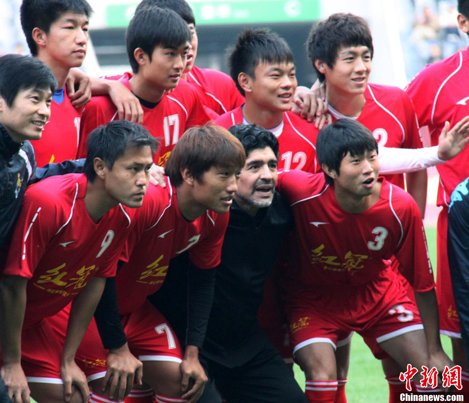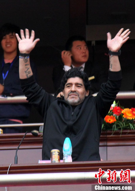 11月5日下午16時左右,世界球王馬拉多納來到山東濟南奧體中心參加山東聯(lián)隊與阿根廷明星隊的慈善比賽。圖為馬拉多納向現(xiàn)場的觀眾和球迷揮手致意。中新社發(fā) 牛杰峰 攝