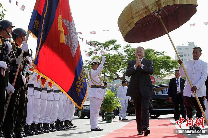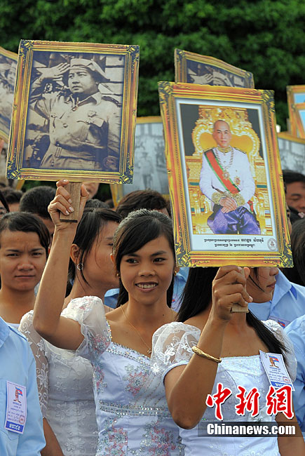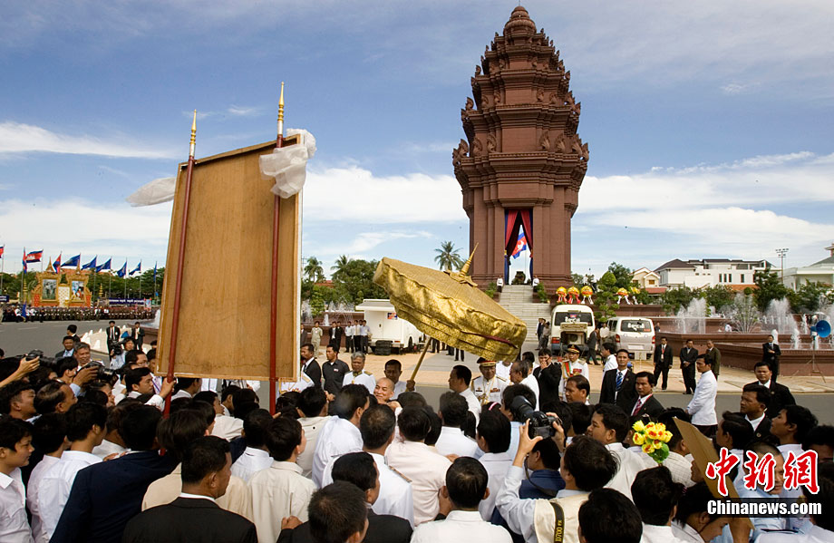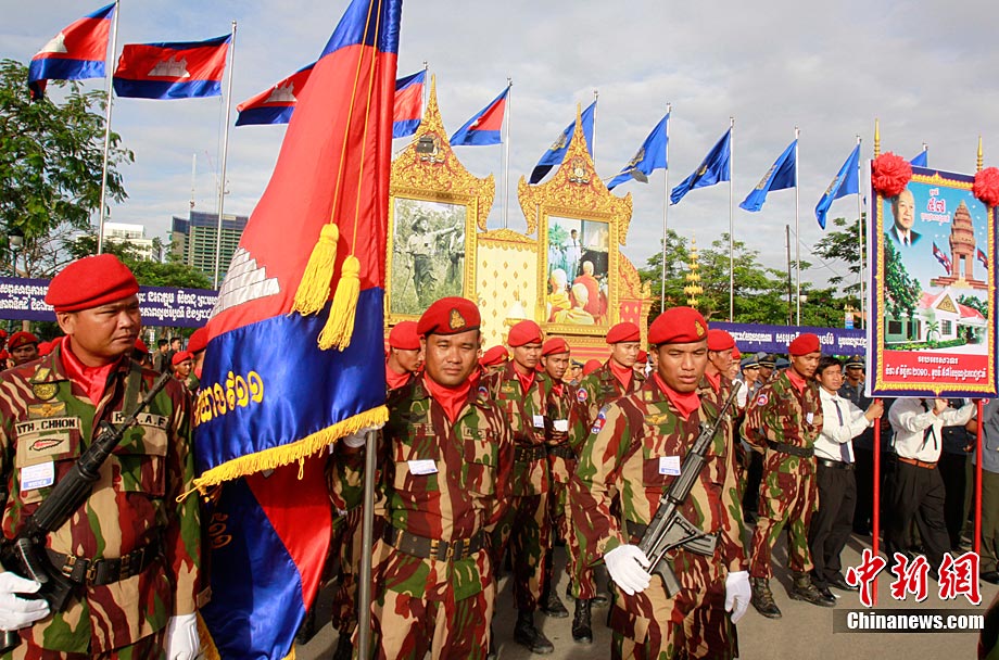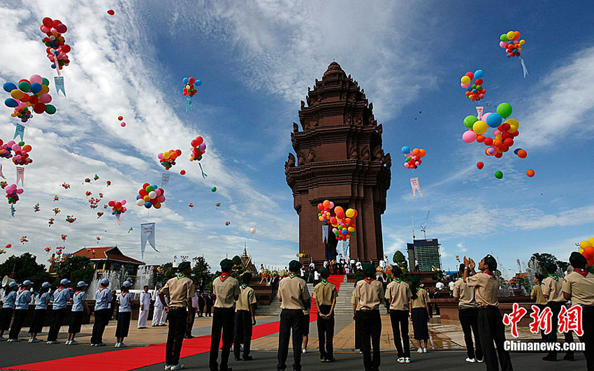 11月9日,工作人員在獨(dú)立節(jié)慶祝儀式上放飛彩球。當(dāng)天,柬埔寨在金邊獨(dú)立紀(jì)念碑廣場舉行盛大儀式,熱烈慶祝國家獨(dú)立57周年。柬埔寨國王西哈莫尼、國會主席韓桑林、政府首相洪森等政要以及各國駐柬使節(jié)和各界代表約2萬人出席儀式。