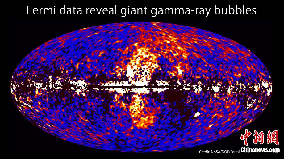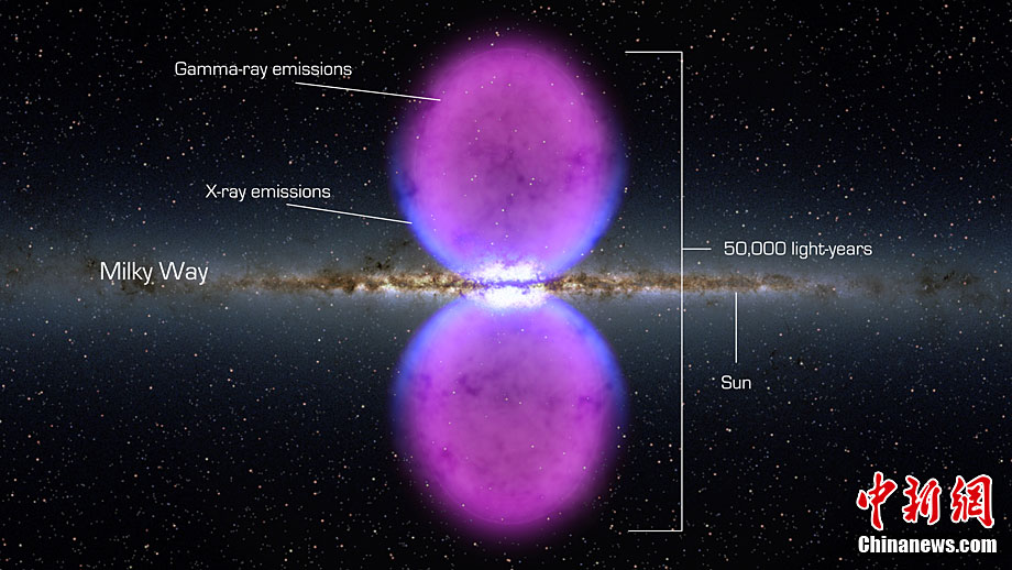 科學家日前最新探測發(fā)現(xiàn)銀河系中心溢出高能量放射線形成的兩個巨大氣泡,并認為這兩個巨大的氣泡源自一個超大質(zhì)量黑洞的噴發(fā)。每個神秘的宇宙氣泡結(jié)構(gòu)直徑跨越25000光年,兩個氣泡連接起來可覆蓋可見夜空一半的區(qū)域,它們噴射著伽馬射線(高能量波長光線)。