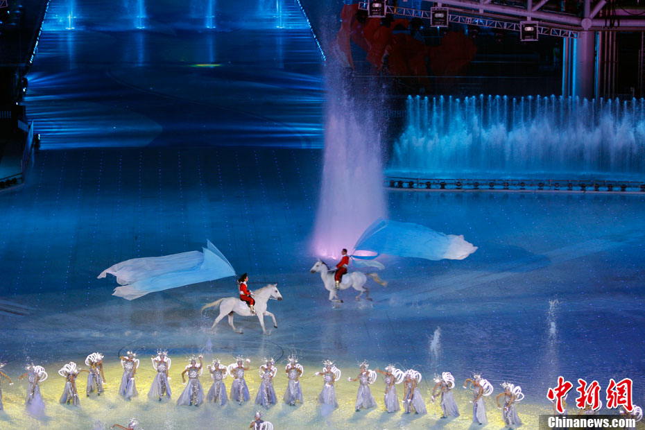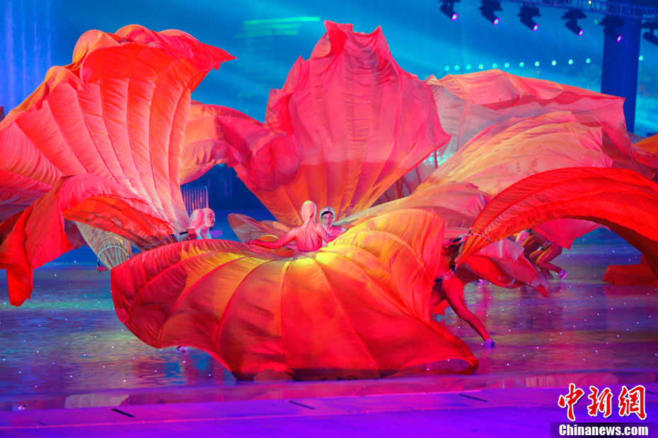 11月12日晚,第16屆亞運會開幕式在廣州海心沙舉行,宏大、絢麗的文藝匯演《啟航》給亞洲以及世界觀眾帶來藝術(shù)盛宴。水是廣州亞運開幕式最主要的創(chuàng)意元素,幕式的表演從一滴水到汪洋大海,從一葉扁舟到巨型帆船,從一汪情水到滔天巨浪。演員們用各種表演手段盡情展現(xiàn)水的魅力,表達水是生命之源、滋養(yǎng)萬物、呵護人類文明的精神內(nèi)涵,令人嘆為觀止。中新社記者 杜洋 攝