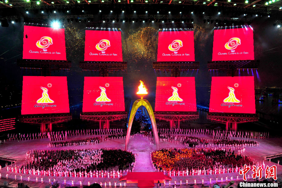 11月12日,廣州亞運(yùn)會(huì)開幕,火炬手持亞運(yùn)圣火跑入會(huì)場(chǎng)。中新社記者 盛佳鵬 攝