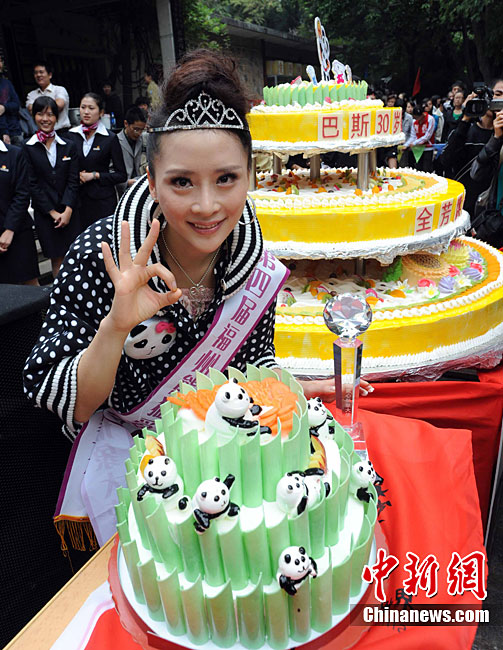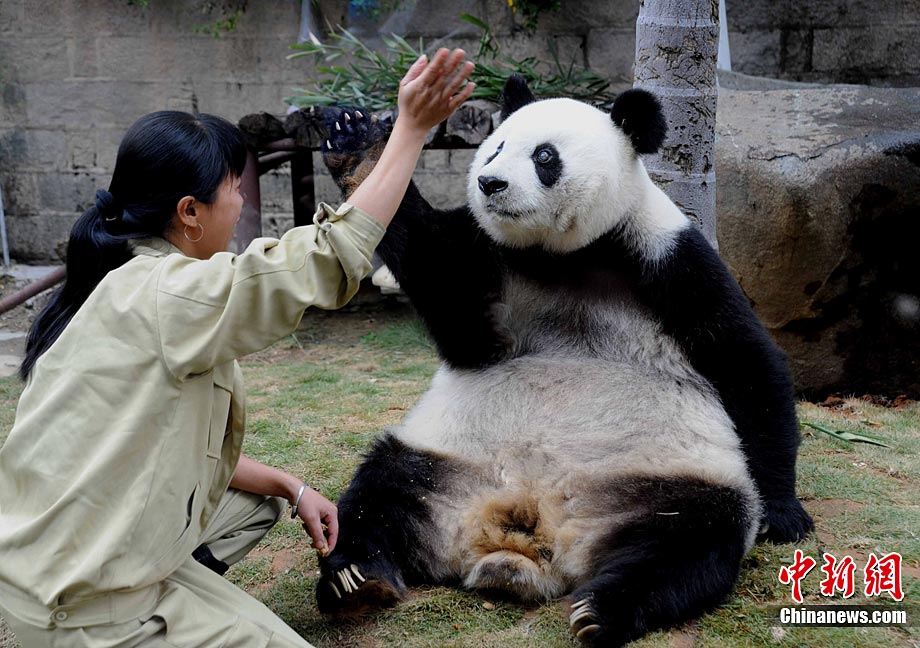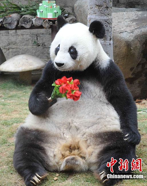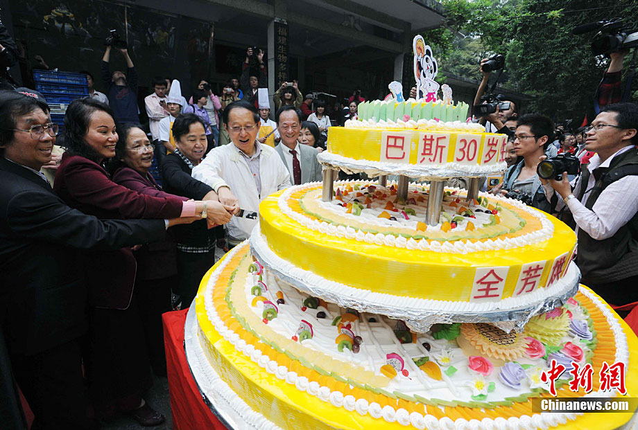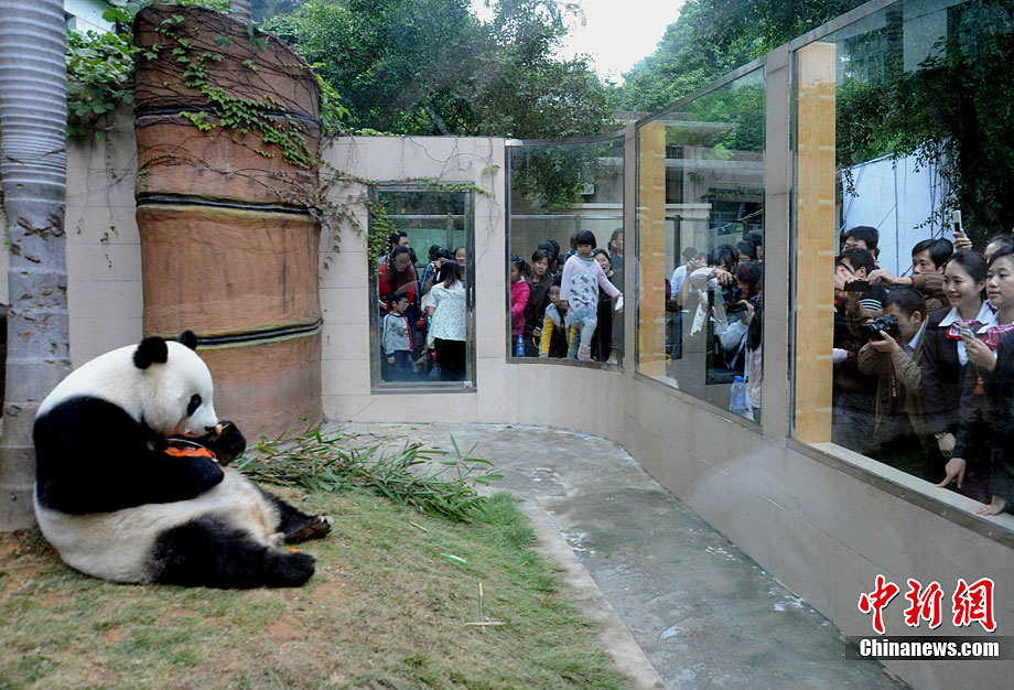 11月13日,福州熊貓世界、福州大熊貓研究中心在福州為聞名海內(nèi)外的1990年北京亞運會吉祥物“盼盼”的原型——大熊貓明星“巴斯”舉辦隆重的30歲(相當于人類一百多歲)生日慶典系列活動,來自海內(nèi)外三千多名各界人士參加該慶典活動。福州熊貓世界飼養(yǎng)員為歡度30歲生日(相當于人類一百多歲)的北京亞運會吉祥物“盼盼”的原型——大熊貓明星“巴斯”送上專門制作的生日蛋糕。中新社記者 劉可耕 攝