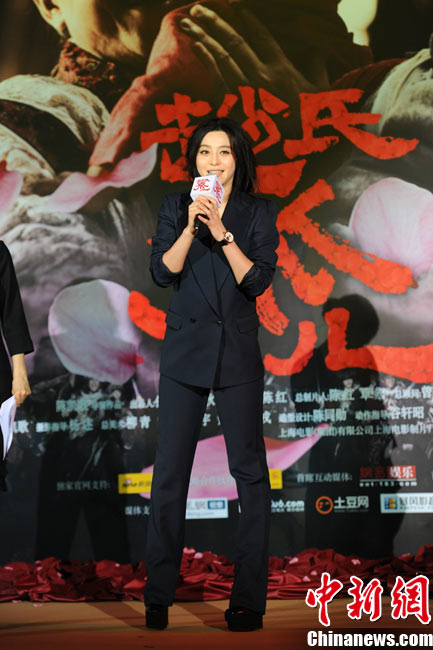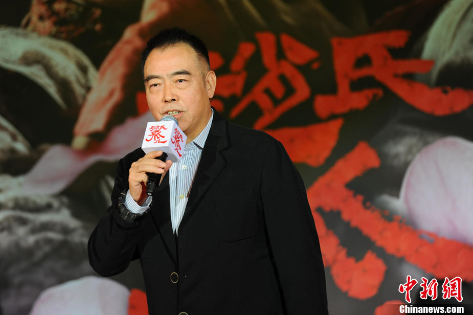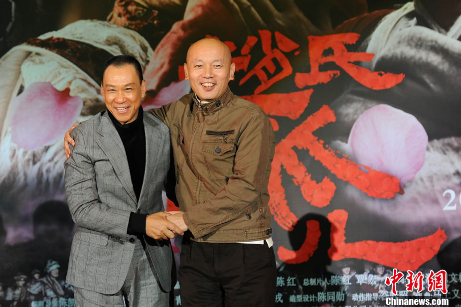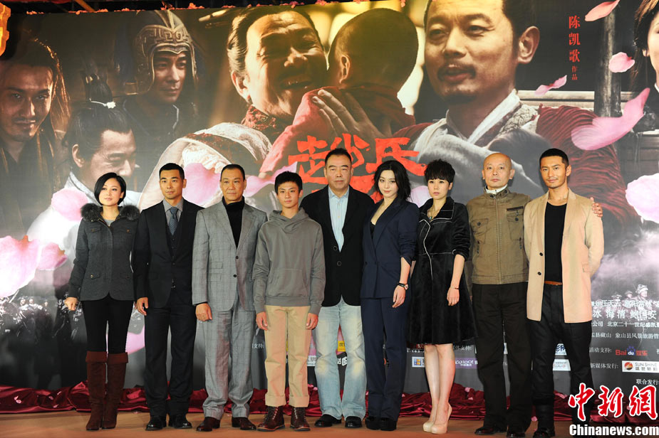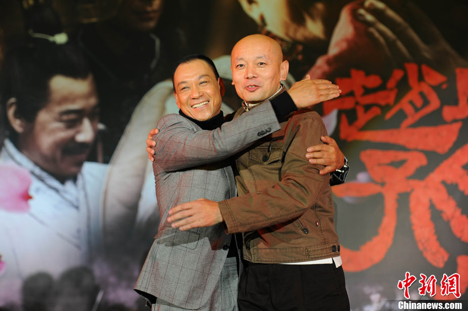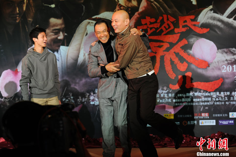 11月15日,賀歲檔大片《趙氏孤兒》群星閃耀媒體見面會在北京盛大舉辦。導(dǎo)演陳凱歌攜主演葛優(yōu)、王學(xué)圻、黃曉明、范冰冰、趙文卓、海清、趙文浩出席。葛優(yōu)、王學(xué)圻飾演的程嬰和屠岸賈在片中有諸多較量,此前傳聞兩位大腕暗自使勁、互相飚戲。為了打破傳言,現(xiàn)場葛優(yōu)、王學(xué)圻上演“親密熊抱”,王學(xué)圻出人意料的“背摔”讓葛優(yōu)險些摔倒在地,F(xiàn)場氣氛熱烈,笑聲不斷。中新社記者 李學(xué)仕 攝