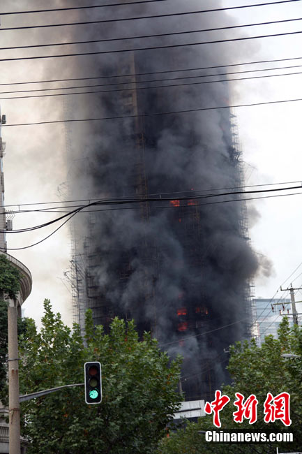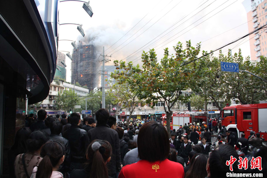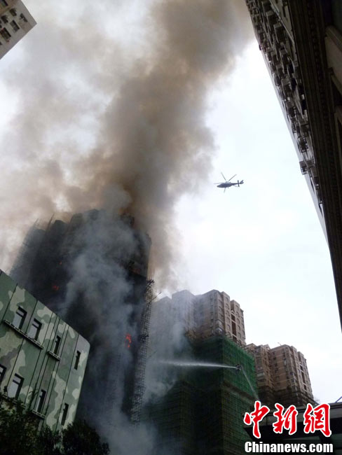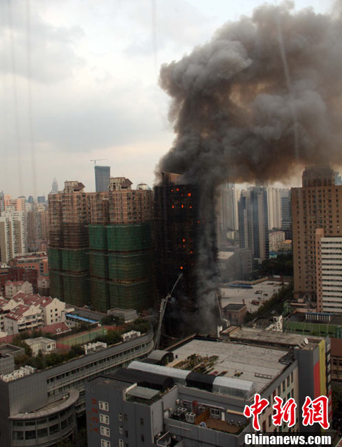 11月15日下午2時(shí)15分,上海中心城區(qū)靜安區(qū)正在進(jìn)行外墻裝修的教師公寓的腳手架起火,火警發(fā)生后,公安民警、消防隊(duì)員迅速趕往現(xiàn)場(chǎng)救援,到場(chǎng)消防車超過10輛。起火原因和損失狀況正在進(jìn)一步調(diào)查中。中新社發(fā) 張嘉森 攝