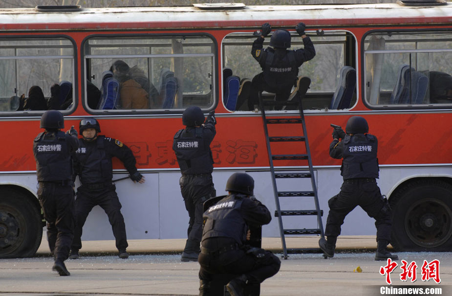 11月16日,河北石家莊特警、治安警、刑警、武警、交警、消防等多警種聯(lián)動,舉行代號為“紅箭突擊——2010”大型反恐處突應急拉動演練。據(jù)指揮部有關負責人介紹,此次演練從實戰(zhàn)出發(fā),主要分為參演隊伍分列式和處突實兵演練,以檢驗重大案(事)件應急處突力量的協(xié)同配合和處置能力。圖為特警“解救”客車上的游人。中新社發(fā) 劉志敏 攝