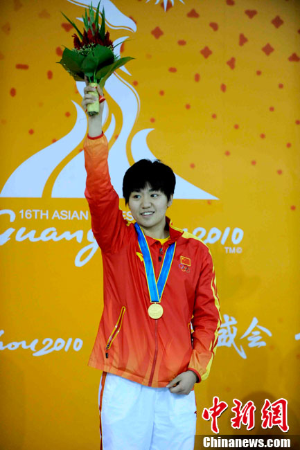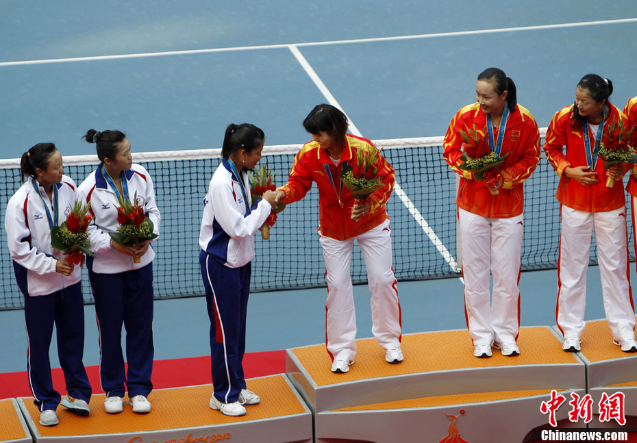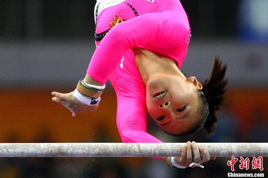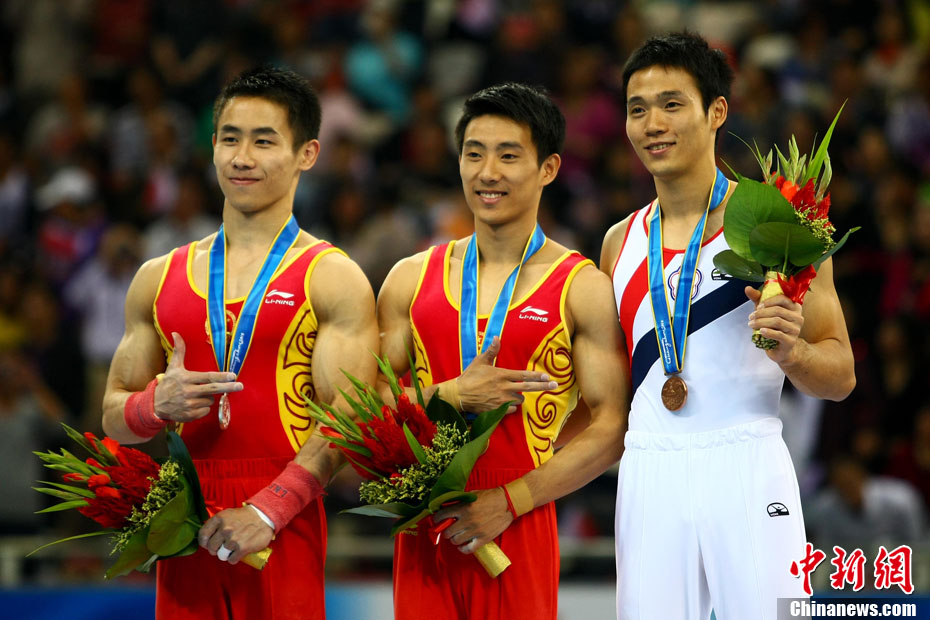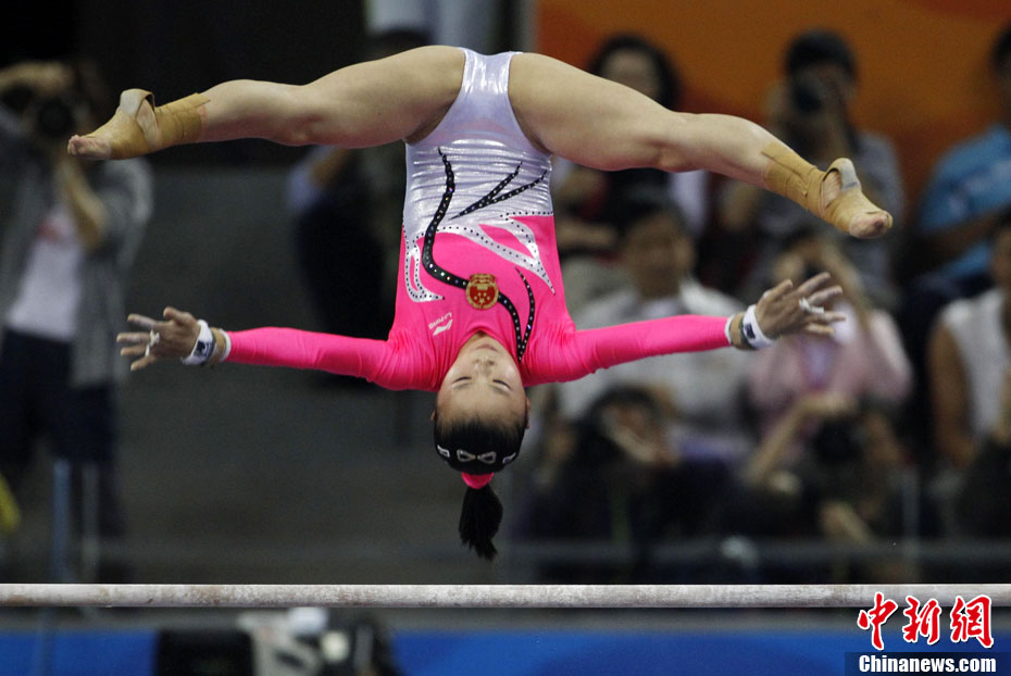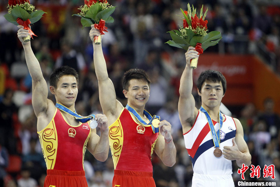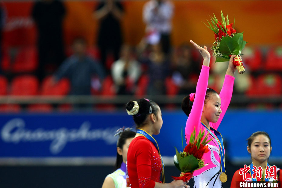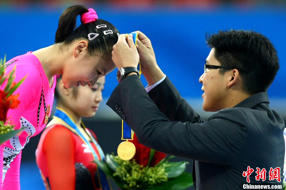 11月16日,2010年廣州亞運(yùn)會(huì)體操比賽繼續(xù)在亞運(yùn)城體育館進(jìn)行。在女子高低杠的爭(zhēng)奪中,中國選手何可欣技高一籌,以16.425的高分封后。她的隊(duì)友黃秋爽摘得銀牌,日本選手鶴見虹子獲得第三。圖為霍啟剛(為)何可欣頒獎(jiǎng)。中新社記者 富田 攝