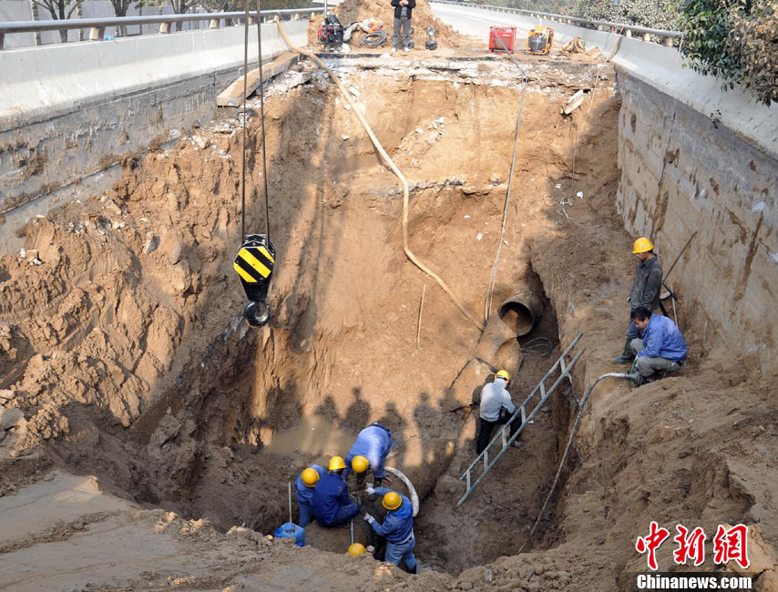 11月18日,河南鄭州爆裂自來水管道正在搶修,鄭州自來水柿園水廠主管道17日發(fā)生爆裂,該水廠是鄭州較大的一所水廠,日供水37萬立方米。目前該事故影響整個鄭州西南部城市供水,幾十萬居民停水,正在緊急調用其他水廠向西區(qū)供水,以滿足日常用水需要。中新社發(fā) 豫分 攝