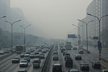 11月19日上午,北京被霧霾天籠罩,能見度較低,西二環(huán)路上的汽車緩慢前行。中新社記者 侯宇 攝
