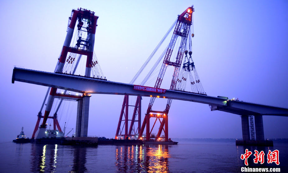 11月19日17時(shí)58分,堪稱“神州第一梁”的崇啟大橋首節(jié)185米鋼箱梁吊裝成功。崇啟大橋位于江蘇啟東和上海崇明島之間,長(zhǎng)185米、寬16米的主橋變截面鋼箱梁精確吊放標(biāo)志著崇啟大橋施工難度最大、技術(shù)最復(fù)雜、安全風(fēng)險(xiǎn)最高的吊裝工程取得關(guān)鍵性勝利,創(chuàng)造了國(guó)內(nèi)橋用鋼箱梁架設(shè)在單節(jié)起吊規(guī)模上的新記錄。 中新社發(fā) 崇啟橋指 供圖