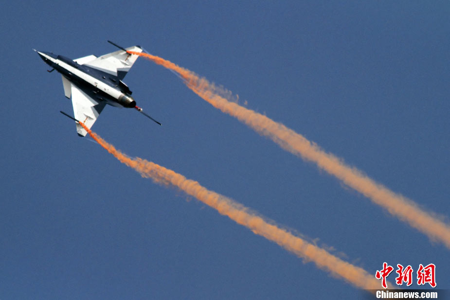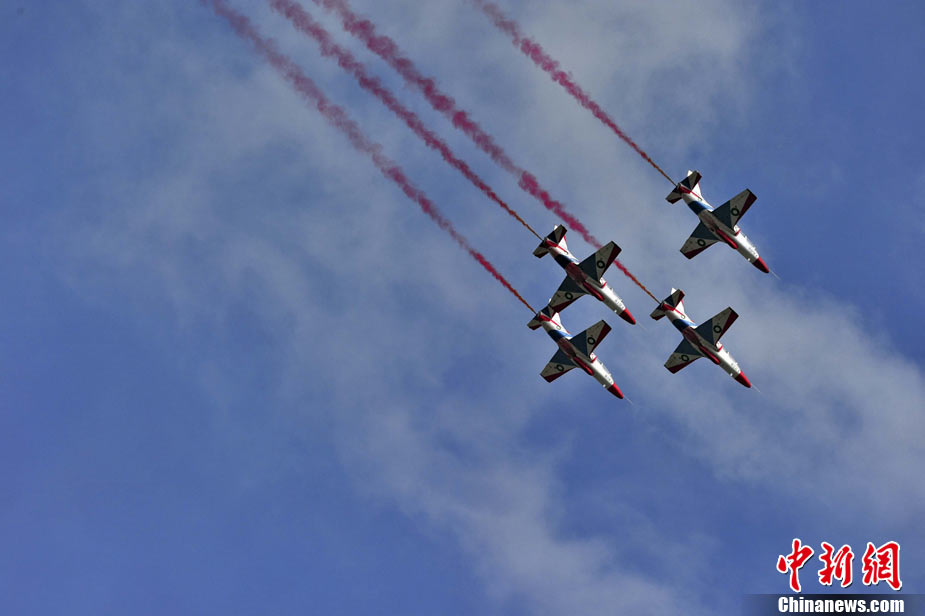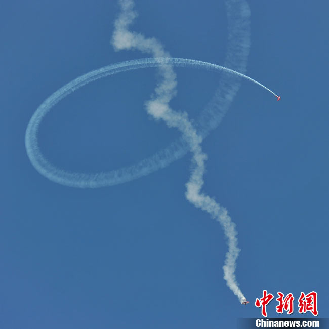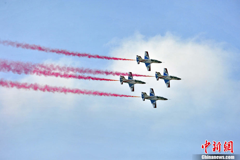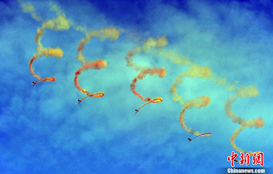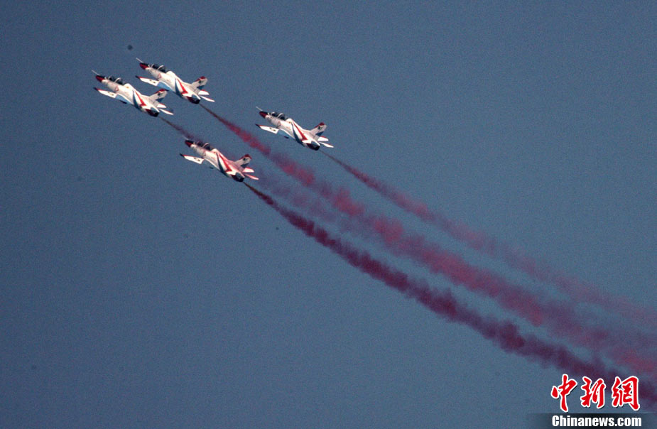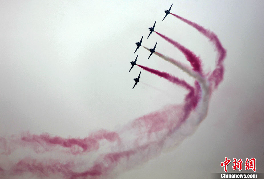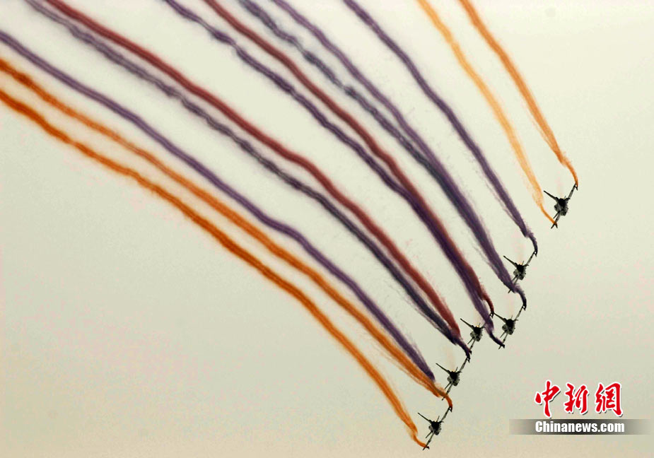 11月19日,在珠海第8屆中國(guó)國(guó)際航空航天博覽會(huì)上,巴基斯坦空軍雄獅飛行表演隊(duì)的空中英豪們駕駛k8教練機(jī),憑借高超的飛行技藝,以珠海機(jī)場(chǎng)上空為舞臺(tái),承、轉(zhuǎn)、啟、合,任意揮灑,給觀看的中外賓客以視覺(jué)享受。中新社發(fā) 喬天富 攝 圖片來(lái)源:CNSPHOTO