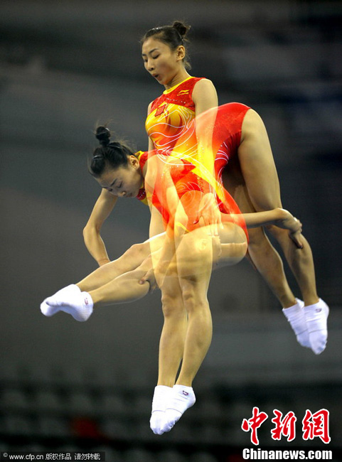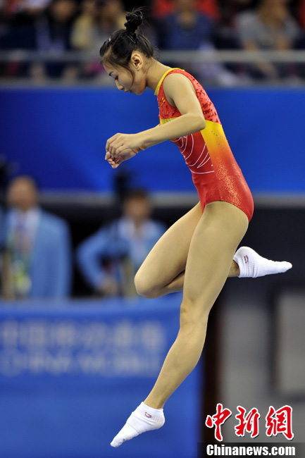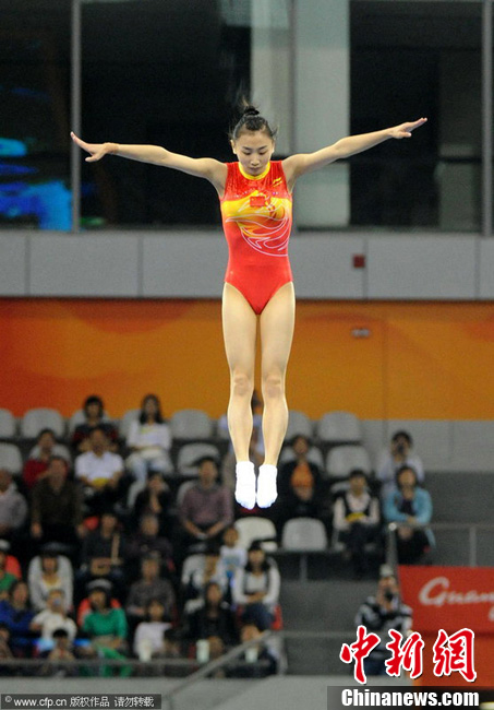 11月21日上午,廣州亞運(yùn)會(huì)蹦床個(gè)人資格賽在亞運(yùn)城體育館上演,中國(guó)女子選手何雯娜、黃珊汕;男子選手選手董棟、涂瀟全部順利晉級(jí)決賽。圖為何雯娜亮相亞運(yùn)城體育館。中新網(wǎng)記者 金碩 攝