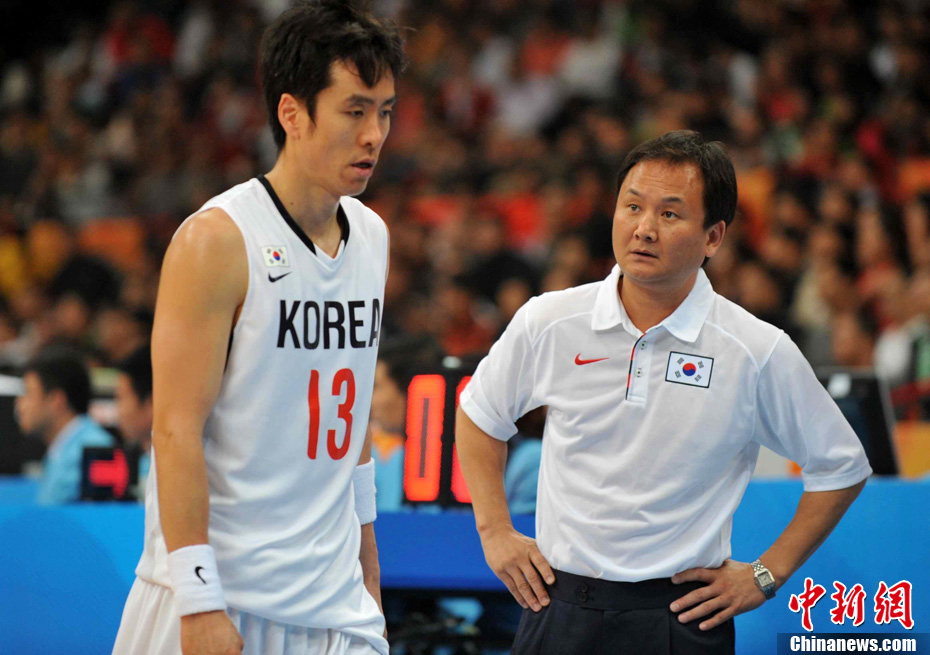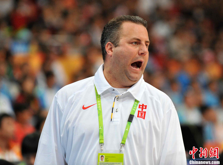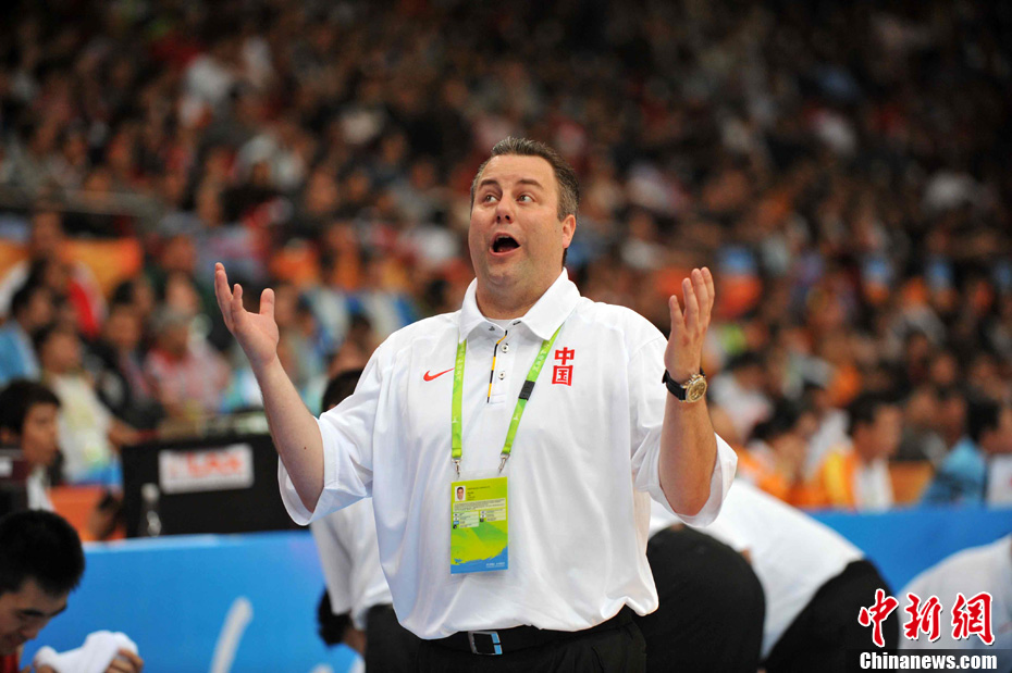 11月21日晚,中國男籃以76:66戰(zhàn)勝韓國男籃,比賽中主帥鄧華德在場(chǎng)邊激情執(zhí)教。中新社記者 柯小軍 攝