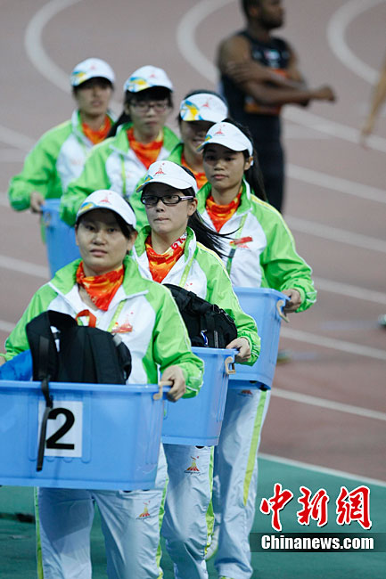 志愿者們正在將運動員們的物品收拾整齊暫時代管。在廣州亞運會比賽期間,志愿者們辛勞的身影已成為比賽場上一道亮麗的風(fēng)景線。中新社記者 張茵 攝