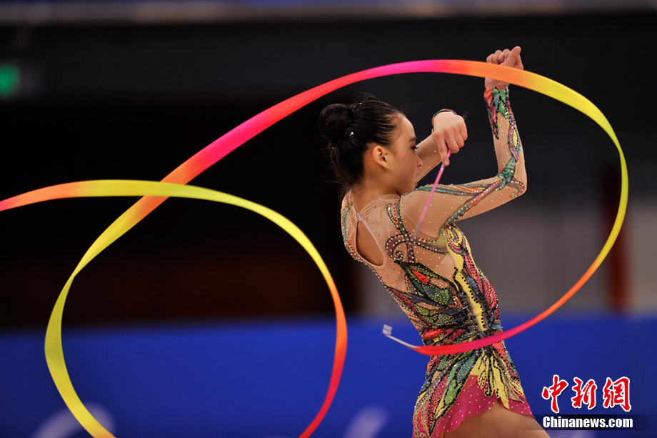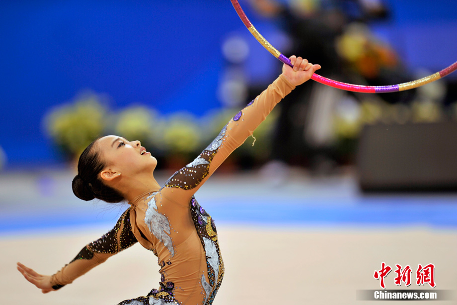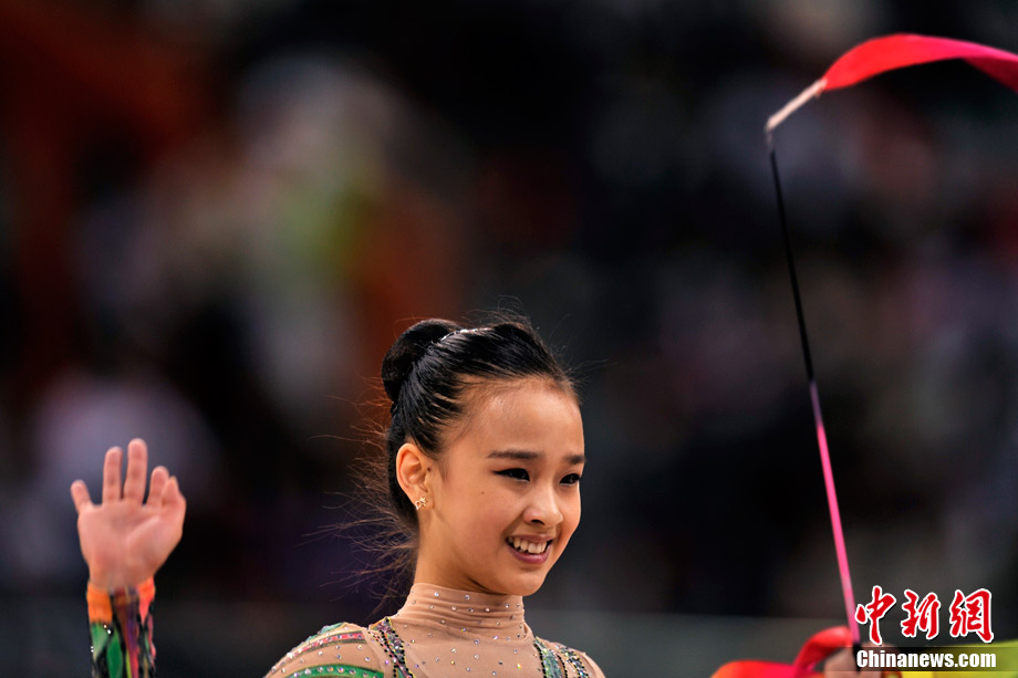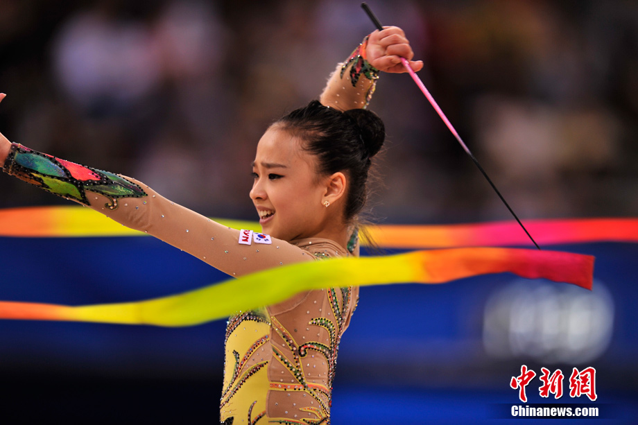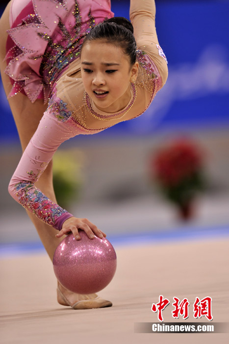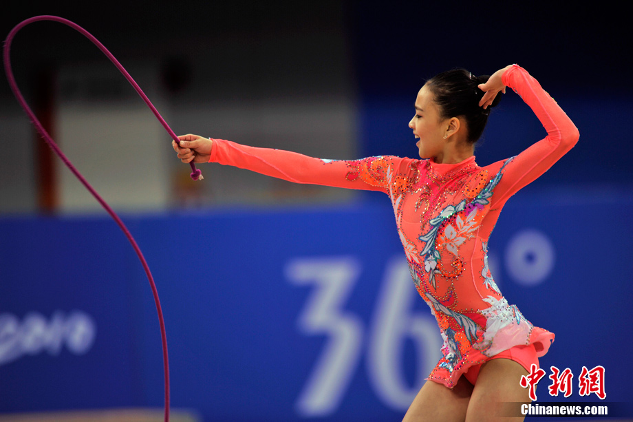 蘿莉,英文名為LOLI,本意指12歲以下的小女孩,后泛指天真可愛的小女生。15歲的韓國藝術(shù)體操選手孫妍在,憑借著修長的身材、姣好的面容,以及明亮的眼眸,一直被人稱為“藝術(shù)體操屆的金妍兒”。堪稱廣州亞運會“小蘿莉”中的NO.1。圖為孫妍在在亞運藝術(shù)體操比賽首日的精彩表現(xiàn)。中新網(wǎng)記者 金碩 攝