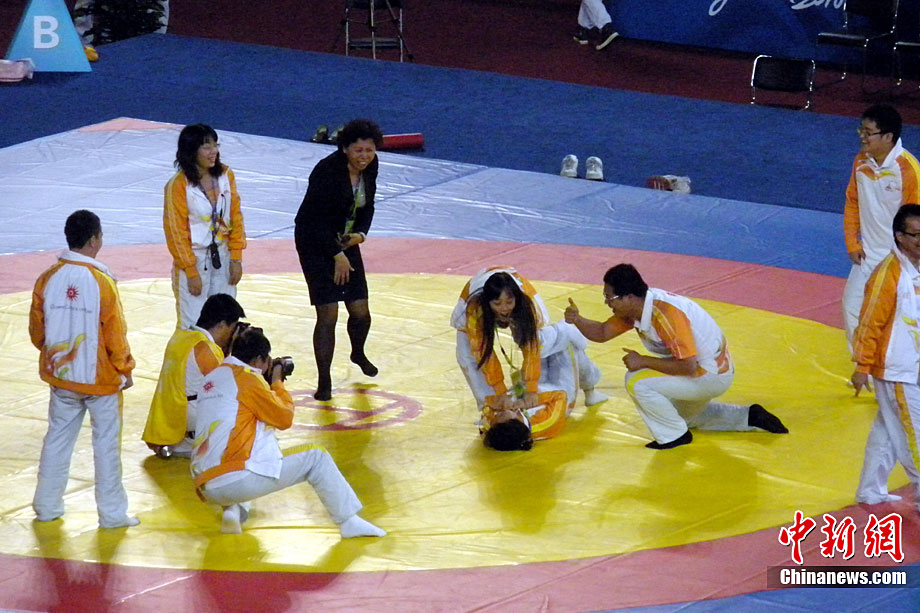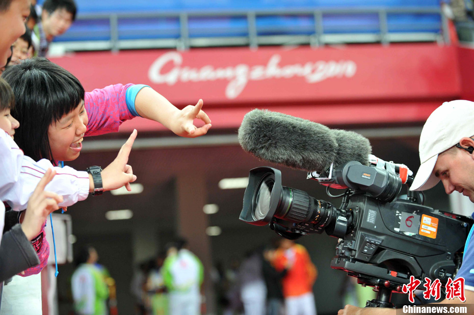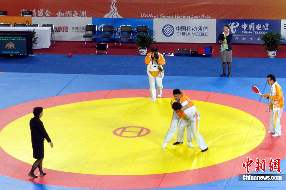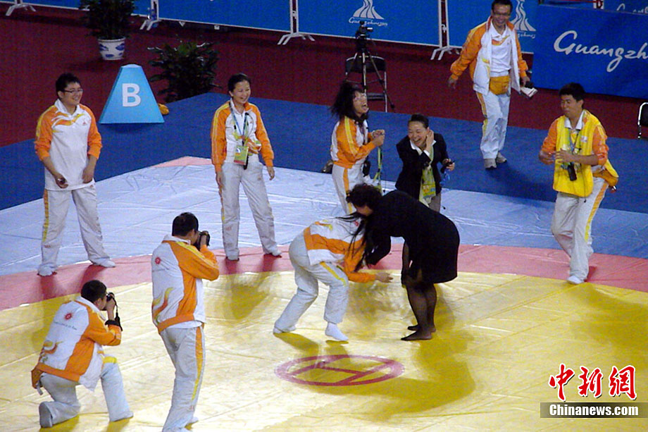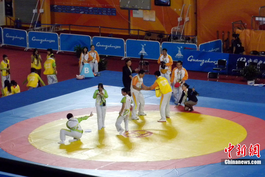 11月26日,廣州亞運會藝術(shù)體操女子個人全能決賽,在亞運城體育館舉行。哈薩克斯坦選手獲得第一名,烏茲別克斯坦選手奪得第二名,韓國選手第三名。中國選手鄧森悅和竇寶寶分別為第五第六名。 亞運會藝術(shù)體操美麗的裁判。 中新社記者 任海霞 攝