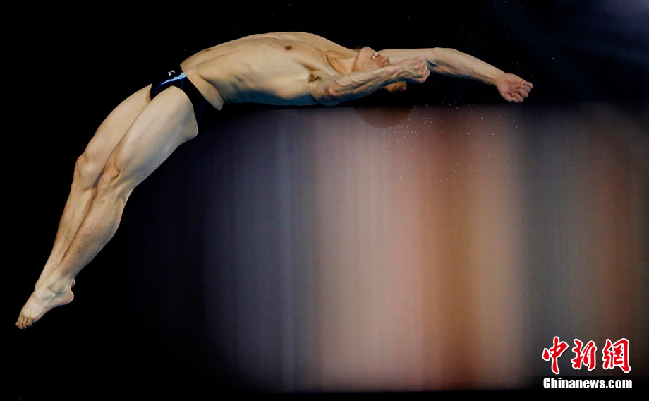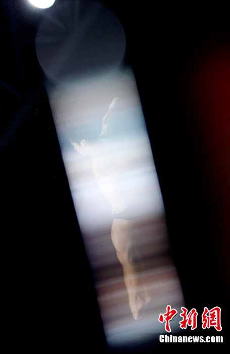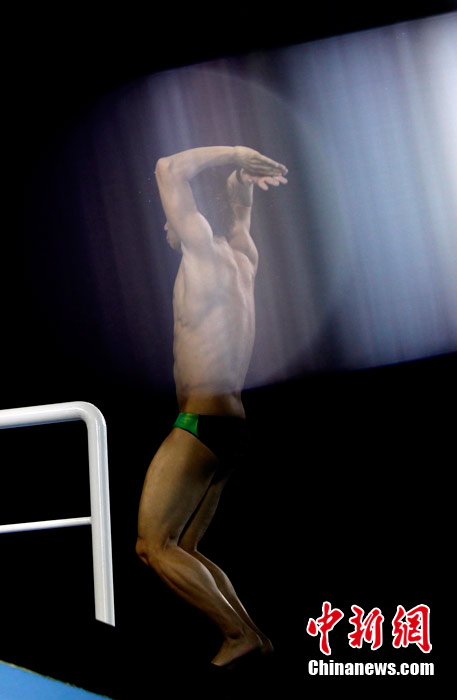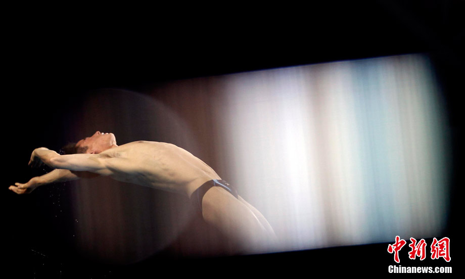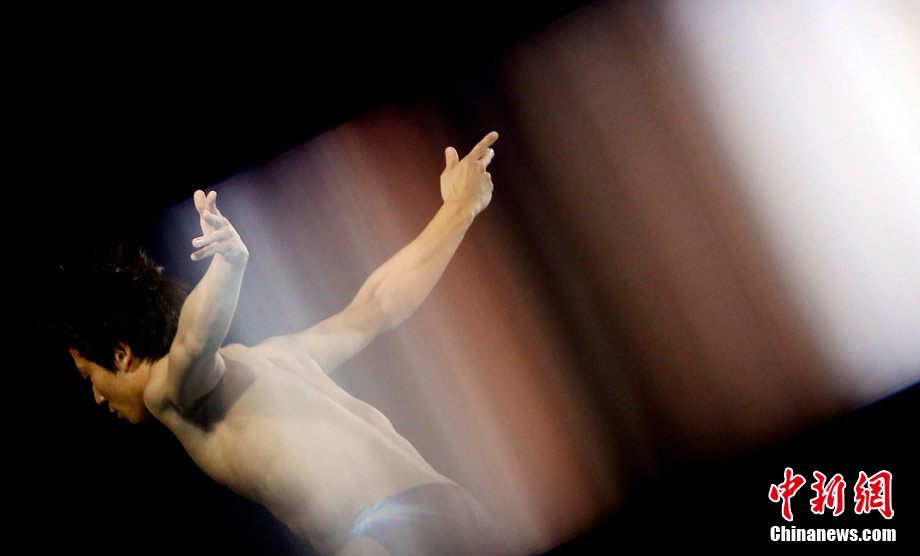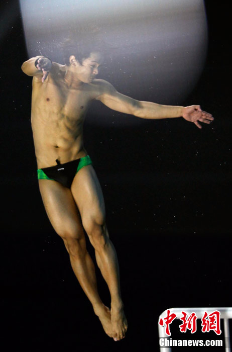 11月26日,廣州亞運(yùn)會,男子10米跳臺,一道神奇的光暈讓運(yùn)動員猶如“天神”。中新社記者 杜洋 攝
