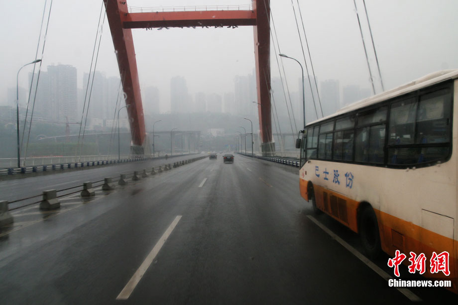 入冬以來(lái),重慶連逢霧天。11月28日,一場(chǎng)雨霧再次來(lái)襲山城重慶。正午時(shí)分,雨霧仍未散去,重慶菜園壩長(zhǎng)江大橋上視線仍不清晰。中新社記者 郭晉嘉 攝