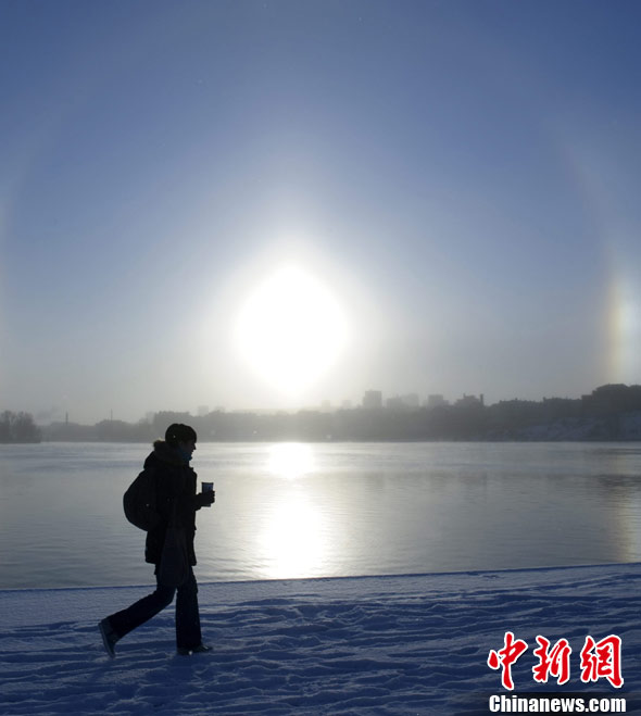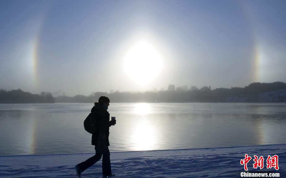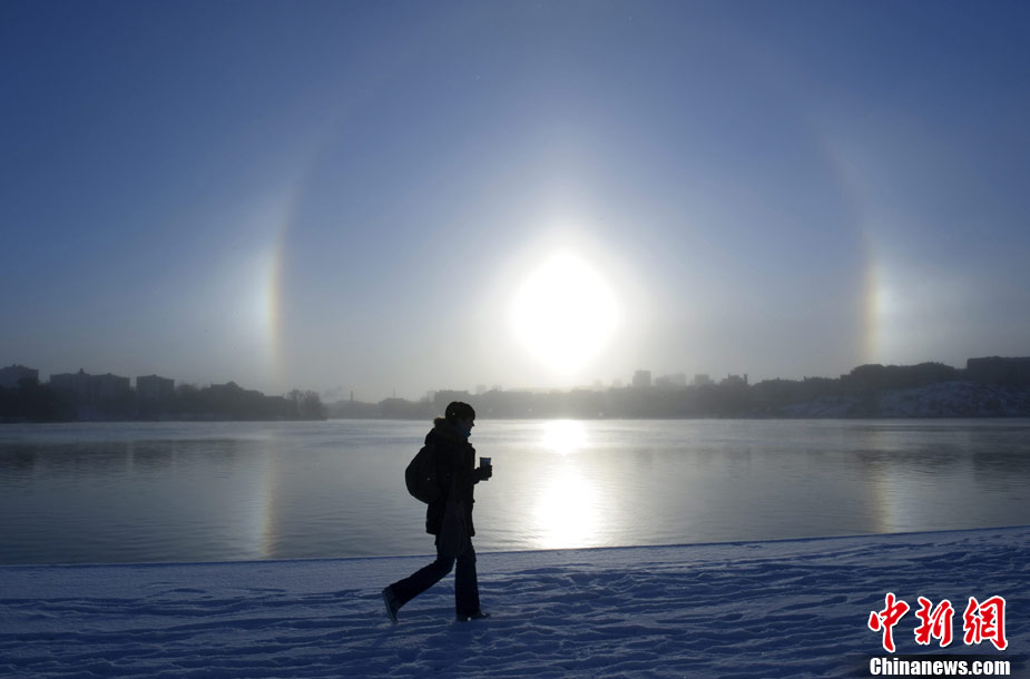 11月30日,瑞典斯德哥爾摩,梅拉倫湖上空出現(xiàn)幻日現(xiàn)象。幻日現(xiàn)象是一種罕見的光暈現(xiàn)象,日光在大氣層中的冰微粒上發(fā)生反射、折射和衍射就可能產(chǎn)生幻日。