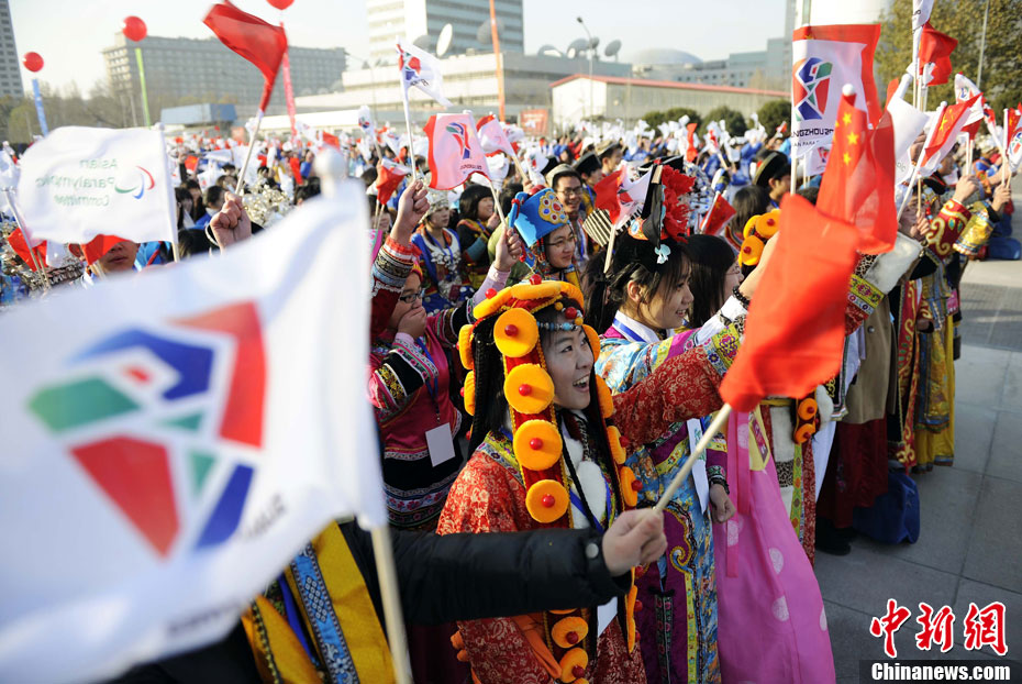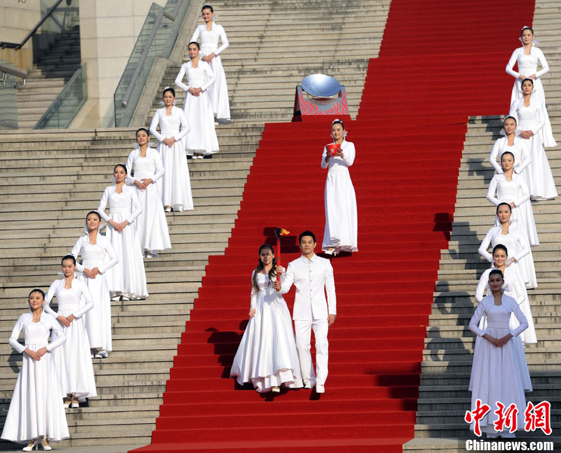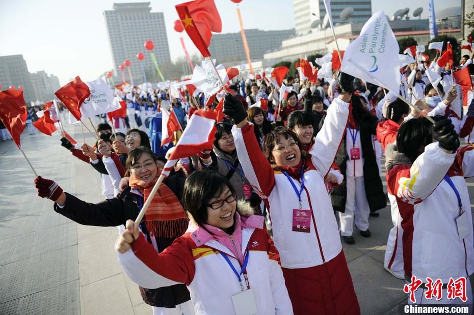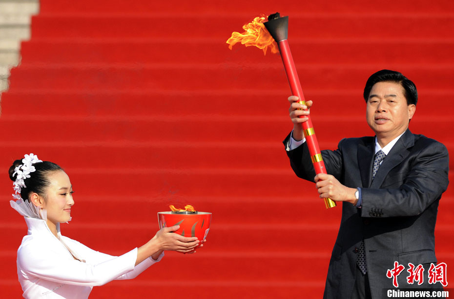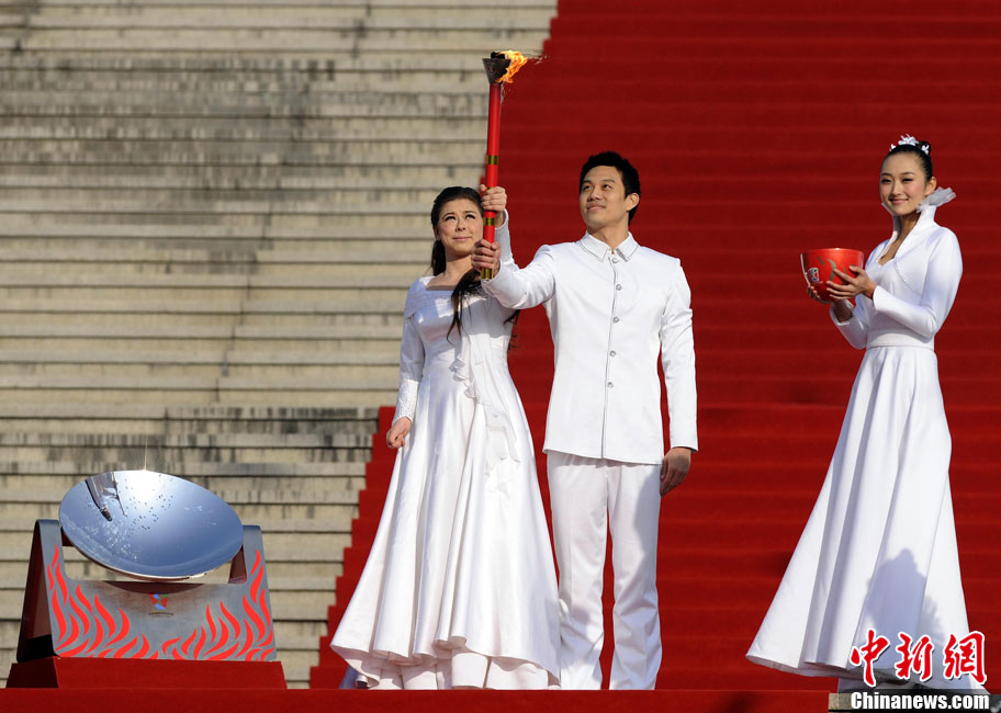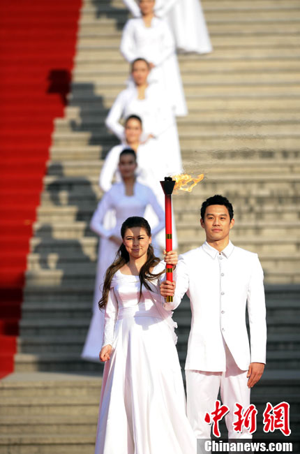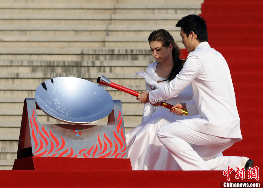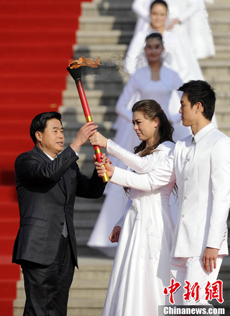 12月3日,采火使者阿迪蘭(左)和周嘉威成功采集亞殘運(yùn)會火種。當(dāng)日,廣州2010年亞洲殘疾人運(yùn)動會火種采集儀式在北京中華世紀(jì)壇舉行。兩名采火使者分別是來自新疆特殊教育職業(yè)中學(xué)的學(xué)生阿迪蘭和廣州亞運(yùn)會三枚金牌得主游泳名將周嘉威。中新社記者 劉震 攝