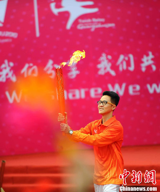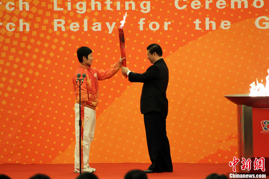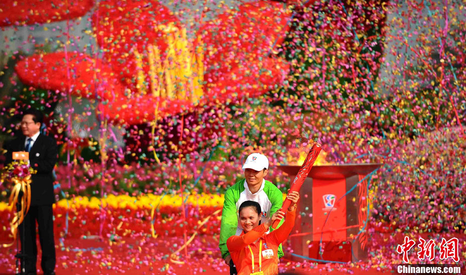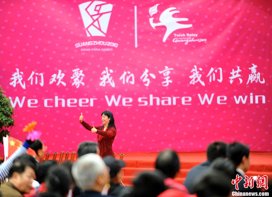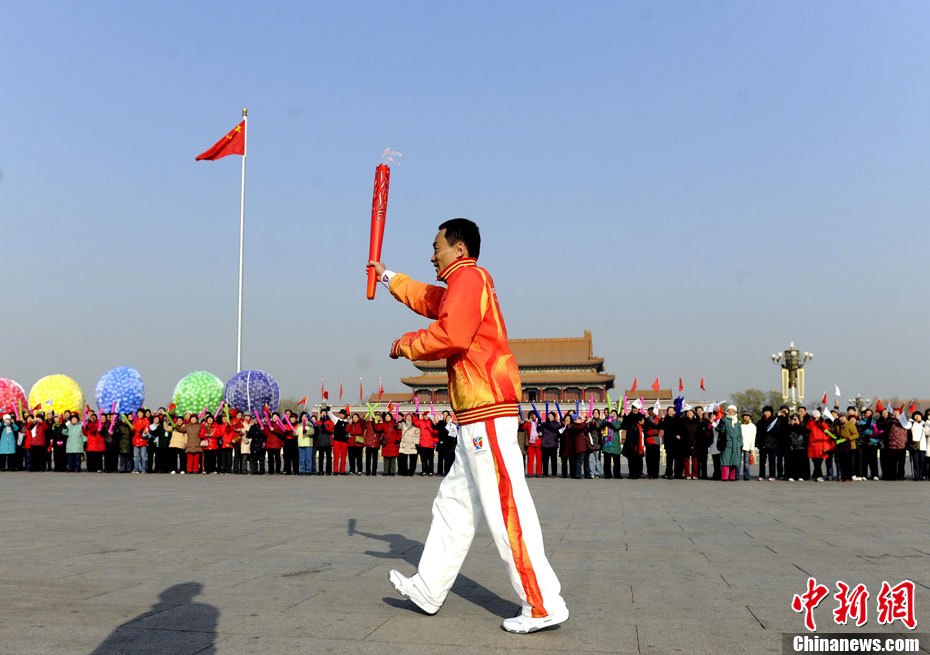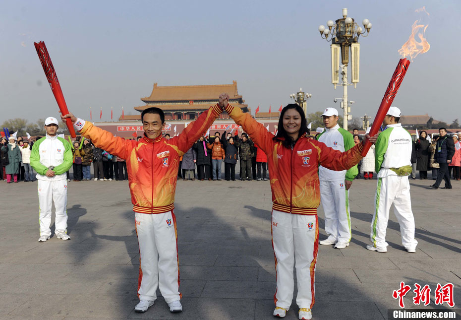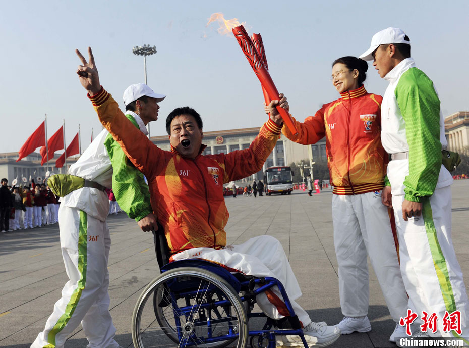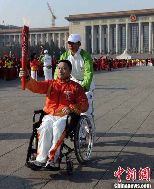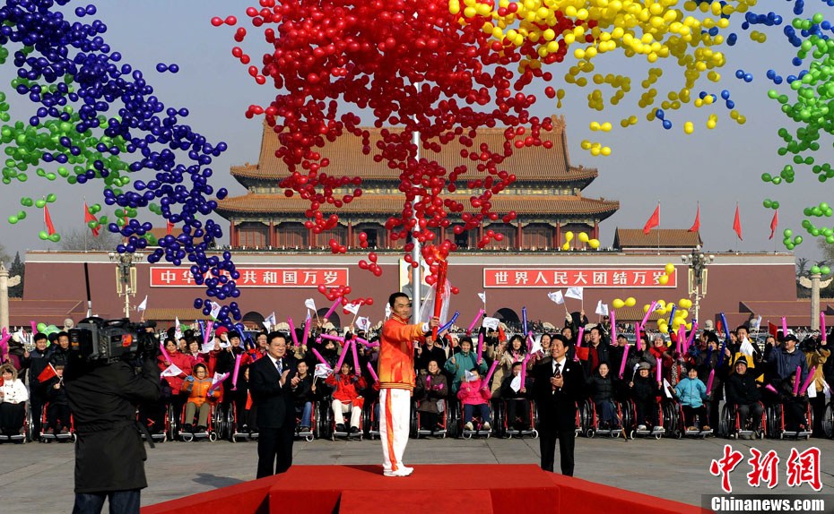 12月4日10時整,廣州2010年亞洲殘疾人運動會火炬點燃暨火炬?zhèn)鬟f活動在北京人民大會堂北大廳啟動。北京站傳遞活動有20棒火炬手,整個火炬?zhèn)鬟f活動圍繞天安門廣場北廣場進(jìn)行。中新社記者 劉震 攝