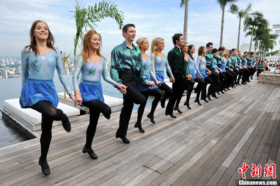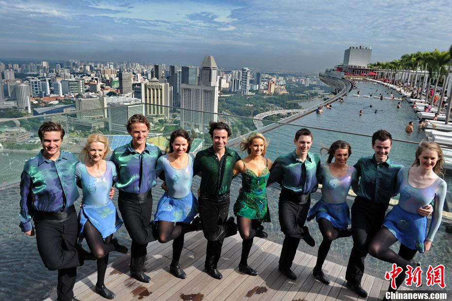 圖為大河之舞愛(ài)爾蘭舞蹈團(tuán)成員在新加坡濱海灣金沙酒店的空中花園合影。