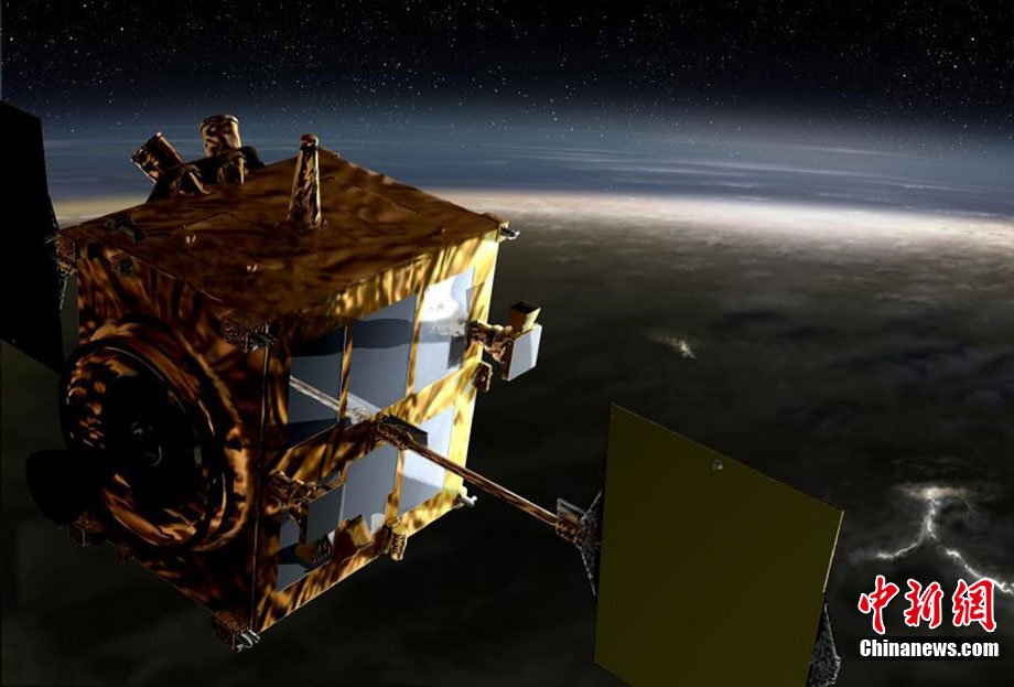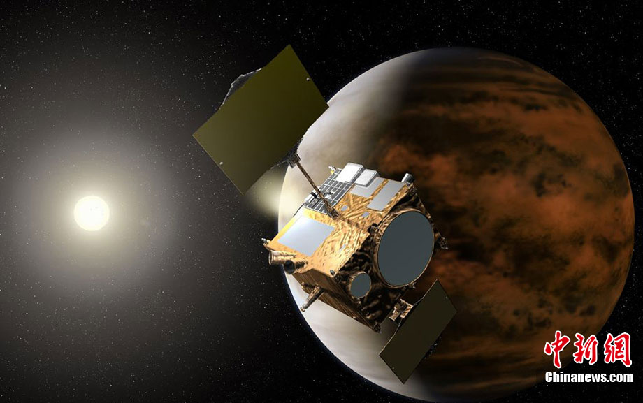2010年5月發(fā)射升空的日本金星探測器“拂曉”號于日本時間12月7日上午抵達距離金星最近處,并進行為進入環(huán)繞軌道的引擎反向噴射。圖為日本金星探測器“拂曉”號抵達金星上空的模擬圖。