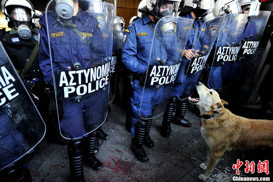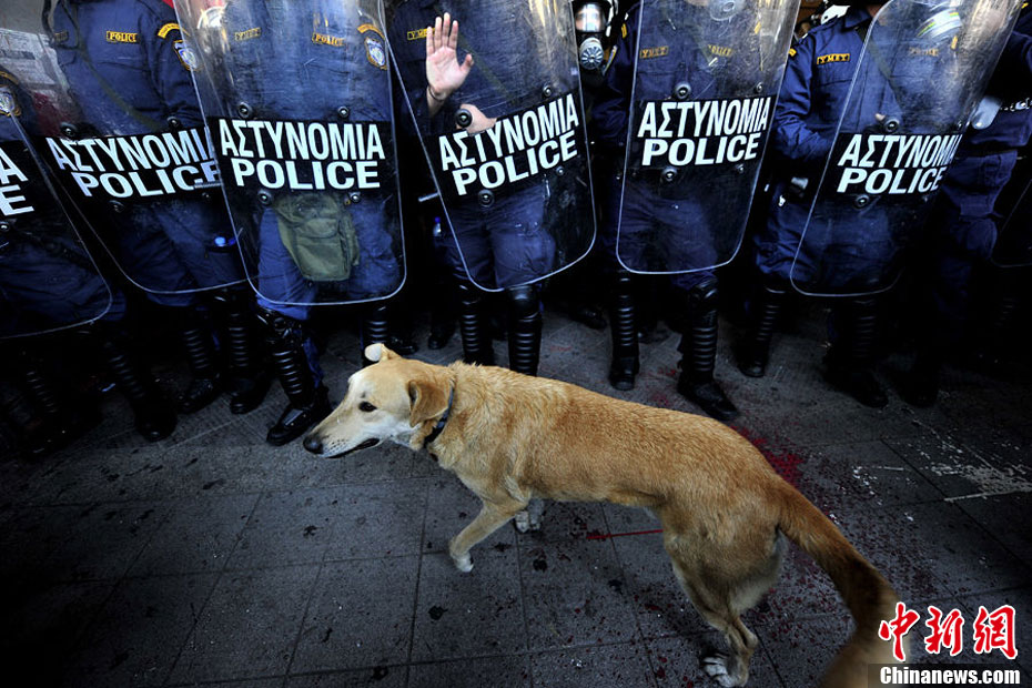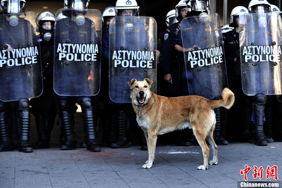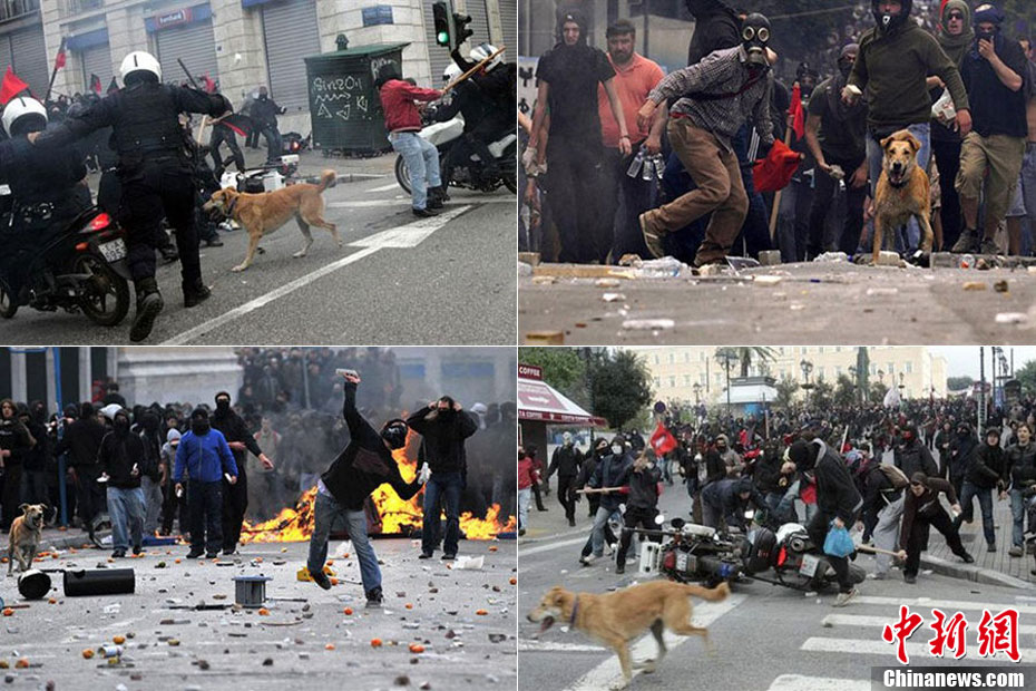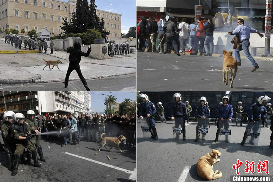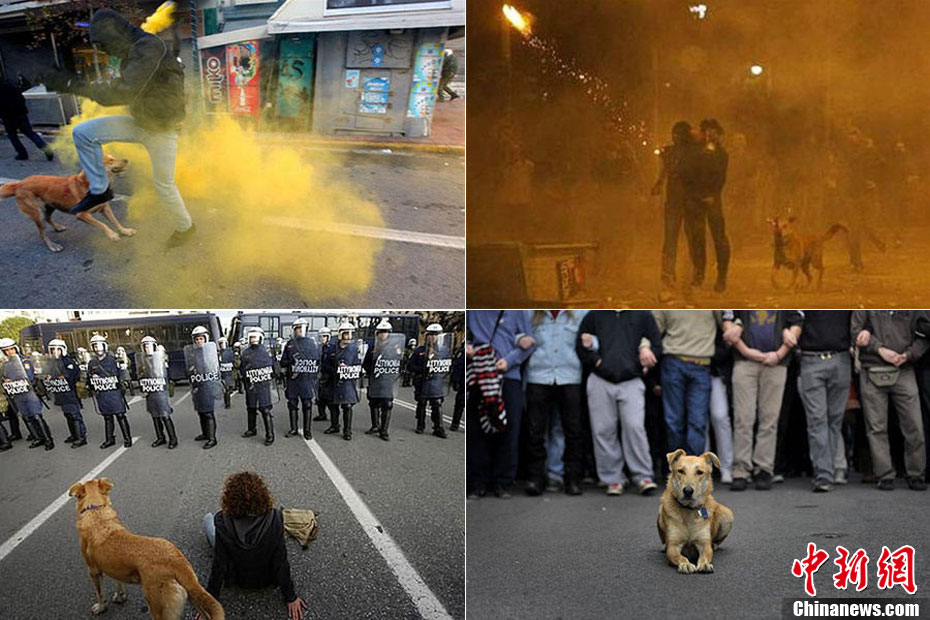 這只沒有主人的黃狗據(jù)說從2008年開始,參加過希臘不下10場的街頭抗議活動,似乎完全不怕催淚瓦斯、汽油彈等巨大爆炸聲響,對于四面八方的人聲尖叫,更像是樂在其中,甚至還懂得向警方吠叫,現(xiàn)在儼然成為希臘抗議人士的吉祥物,甚至還有網(wǎng)友為它建立專屬的Facebook主頁。