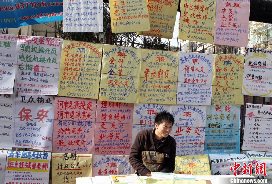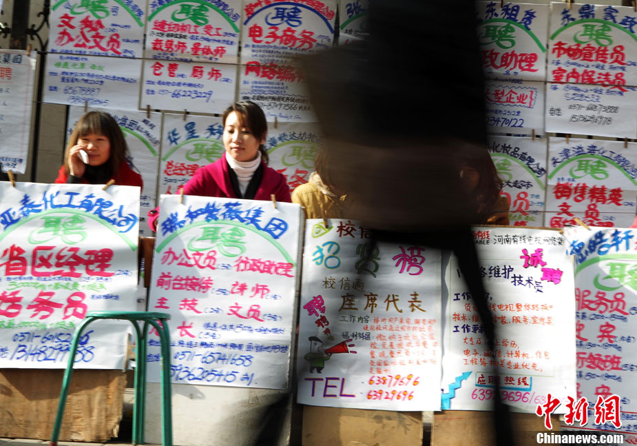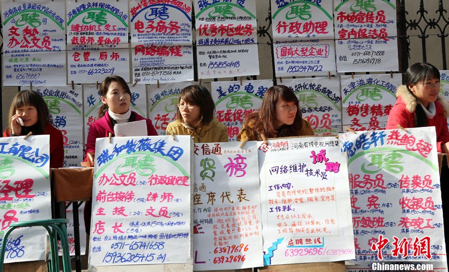 12月11日,年終歲末,在河南省人才市場的馬路上招牌用工者的美女招聘者坐成排等候應(yīng)聘者前來咨詢。許多企業(yè)反映,每到年底都有部分員工請假回家相親結(jié)婚或與家人團(tuán)聚過年,造成工廠人手不夠。