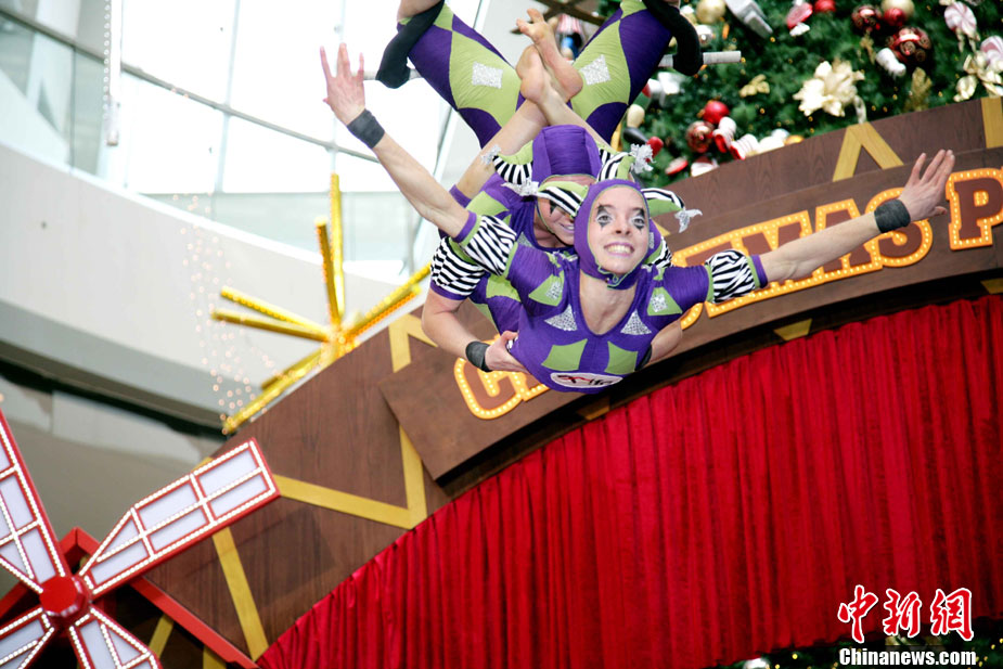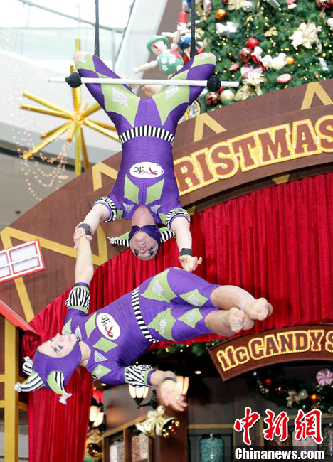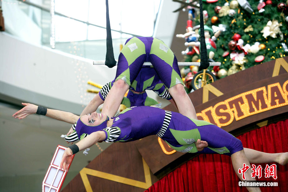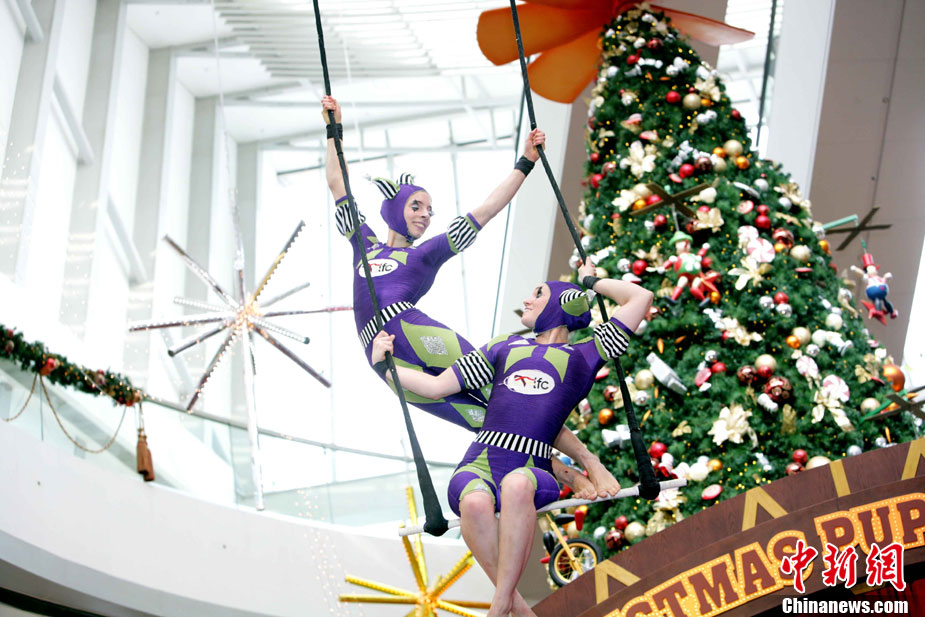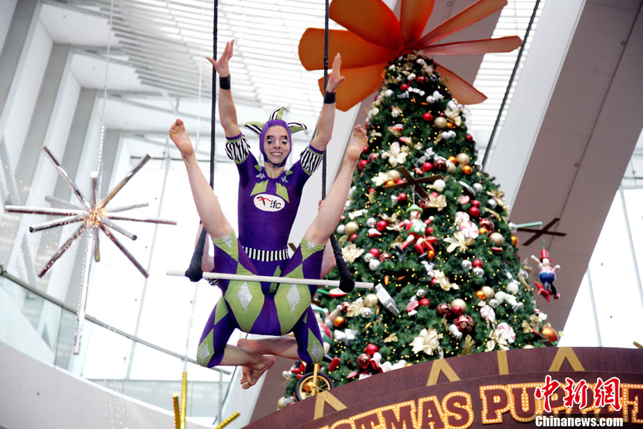 12月14日,香港國際金融中心上演震撼視覺的高空特技。首次來港獻(xiàn)藝的美國著名雜技團(tuán)D Squared Trapeze在圣誕樂園內(nèi)打造雙人空中秋千,凌空飛舞表演,帶給觀眾“飛一般”夢幻體驗。中新社發(fā) 洪少葵 攝