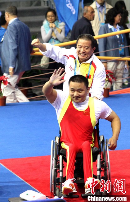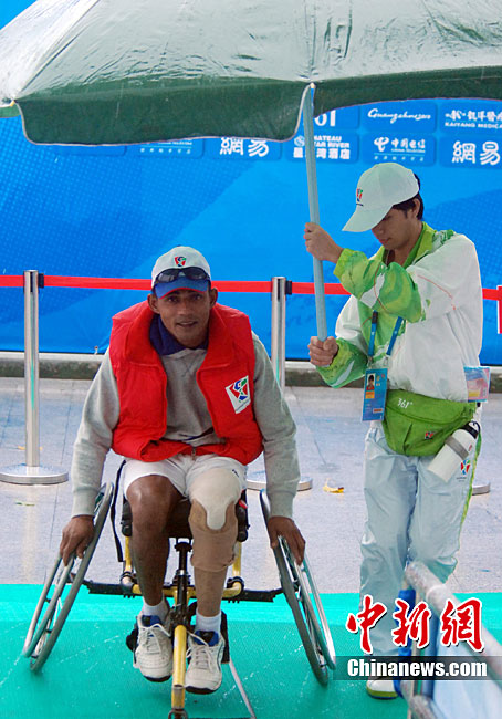 12月15日,志愿者雨天為運(yùn)動員撐傘護(hù)航,無微不至。廣州2010亞殘運(yùn)會,輪椅網(wǎng)球比賽在廣州天河體育中心網(wǎng)球?qū)W校舉行,因雨比賽從室外轉(zhuǎn)向室內(nèi)。尹雪峰 攝