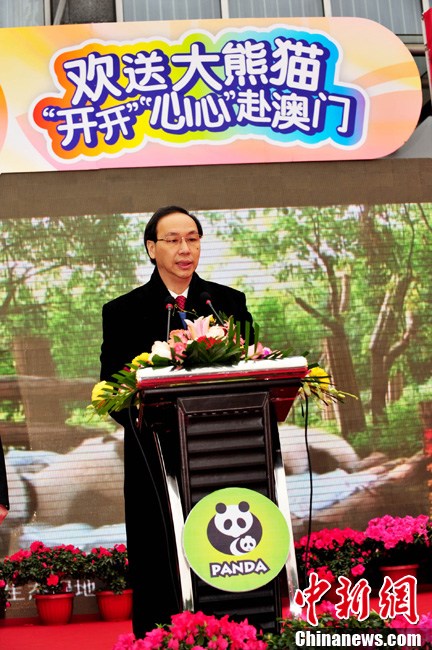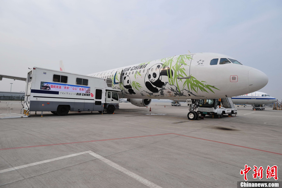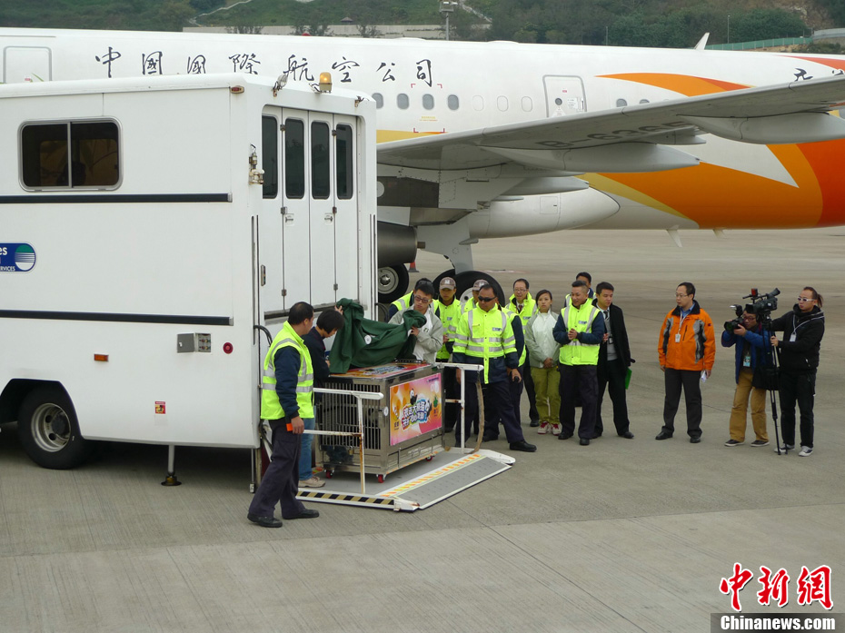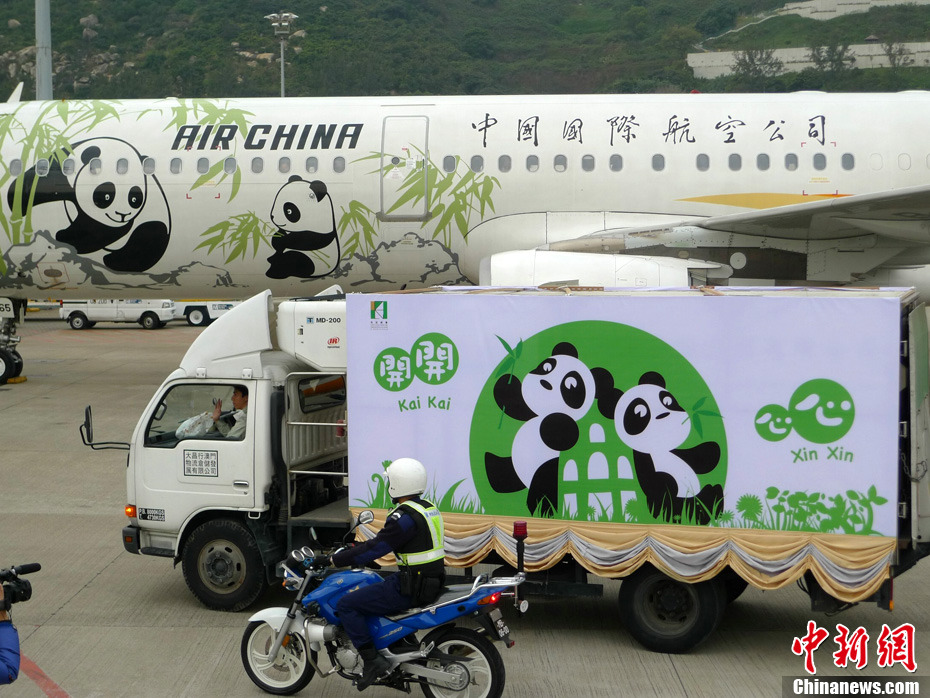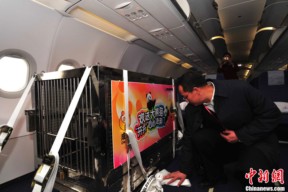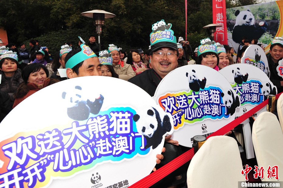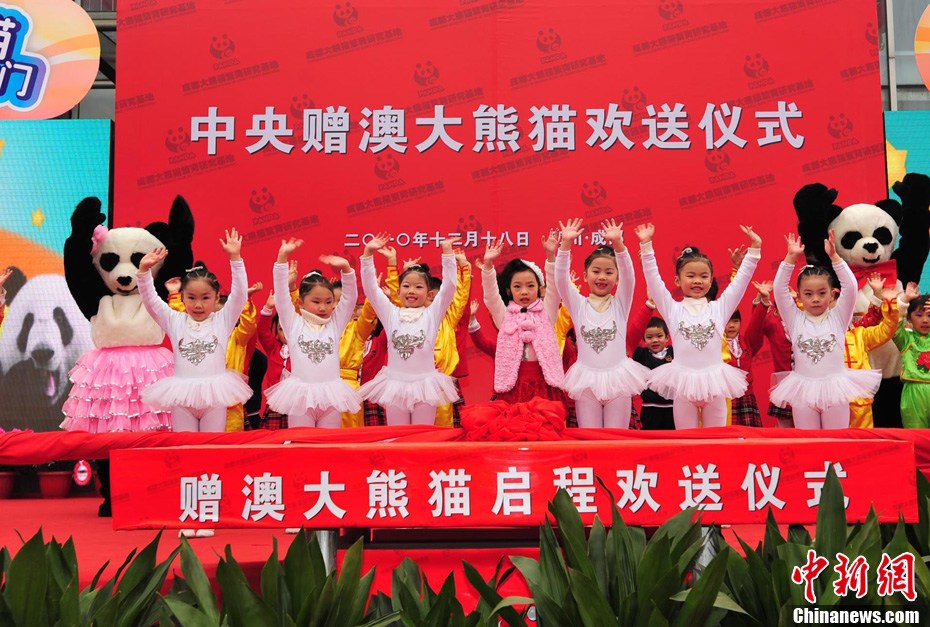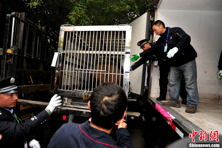 12月18日上午,中央贈(zèng)澳大熊貓歡送儀式在成都大熊貓繁育研究基地的科學(xué)探秘館廣場(chǎng)舉行。儀式后,工作人員將裝運(yùn)“開開”、“心心”的專用籠子搬上專車,開離成都大熊貓繁育研究基地,赴成都雙流國(guó)際機(jī)場(chǎng)。中新社發(fā) 安源 攝