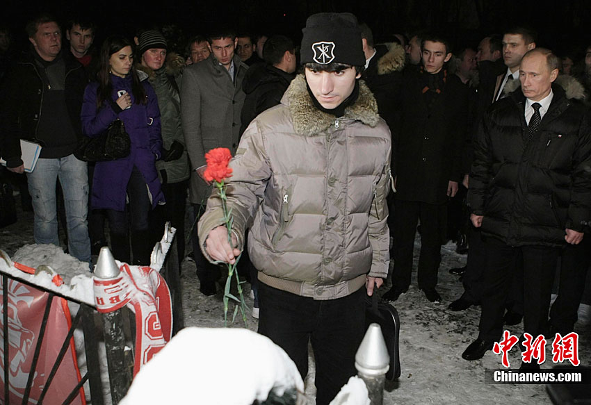 當?shù)貢r間12月21日,俄羅斯總理普京與部分球迷一起,來到日前被槍殺的莫斯科斯巴達克足球俱樂部球迷葉戈爾·斯維里多夫的墓前,獻上鮮花表達哀思。12月5日夜間至6日凌晨,一群斯巴達克隊的球迷與一撥來自北高加索地區(qū)的年輕人在莫斯科北部的喀瑯施塔得林蔭道某汽車站附近發(fā)生斗毆,結果球迷葉戈爾·斯維里多夫被槍殺身亡。
