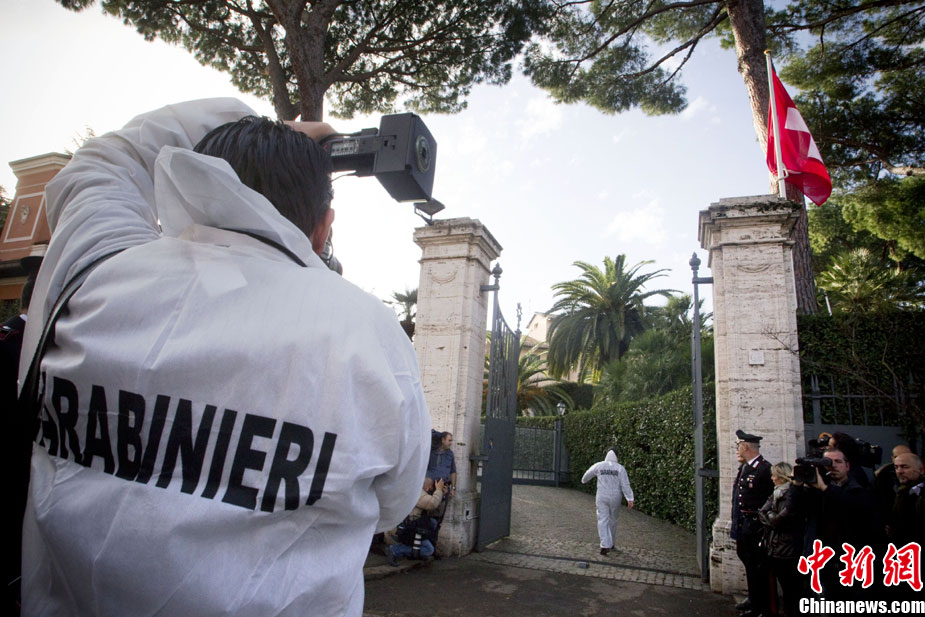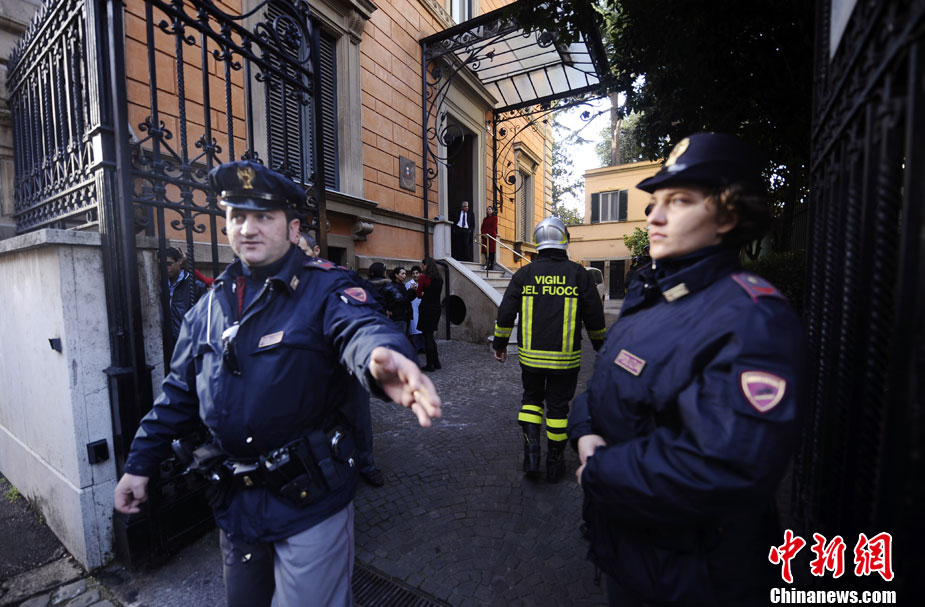 瑞士駐意大利使館一名職員當(dāng)天在拆開(kāi)一個(gè)郵包時(shí),郵包發(fā)生爆炸,該工作人員雙手嚴(yán)重受傷,目前正在醫(yī)院接受治療。時(shí)隔不久,智利駐意大利使館也發(fā)生郵包爆炸事件,一名工作人員受傷,所幸沒(méi)有生命危險(xiǎn)。圖為在智利大使館前警方拉起了警戒線。