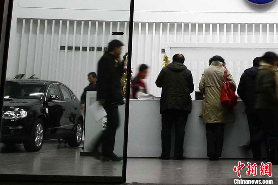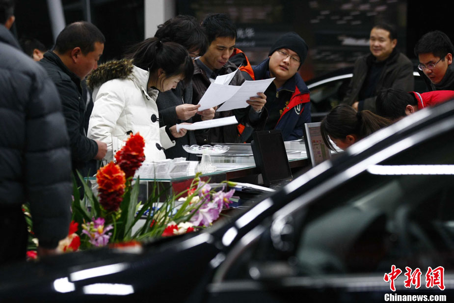 12月23日夜,北京民眾連夜排隊購置新車。當日下午,北京市人民政府新聞辦公室召開“北京交通改善措施”新聞發(fā)布會,正式公布了《關于進一步推進首都交通科學發(fā)展 加大力度緩解交通擁堵工作的意見》,將實行綜合措施治理交通擁堵。其中,2011年度北京小客車總量額度指標控制為24萬個,牌照通過搖號無償分配的政策成為民眾關注的焦點。中新社記者 富田 攝