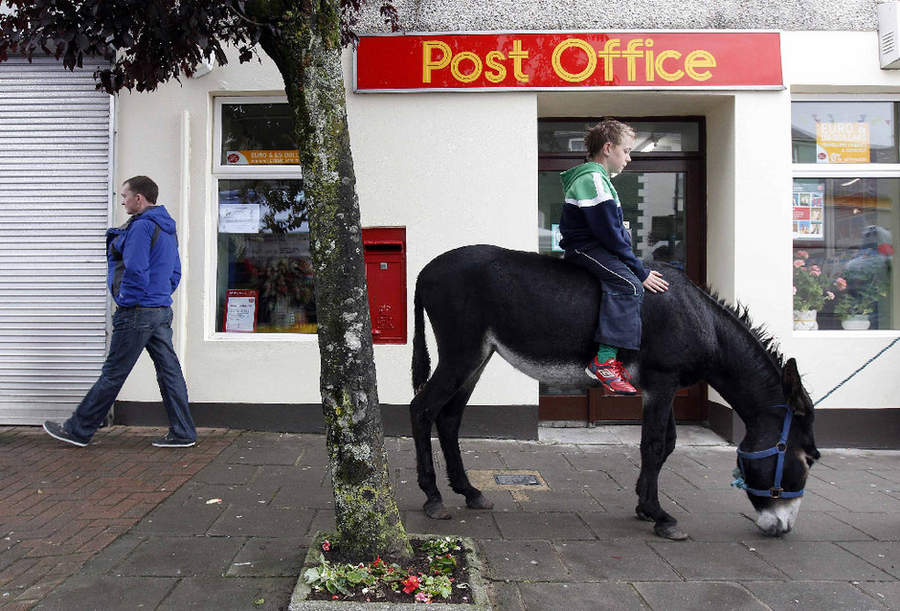 2010年3月23日,在愛爾蘭北部的德里布,一名女子正在向外倒垃圾。旁邊的壁畫上,一名英國士兵正使用大錘子擊倒一棟房子的大門。