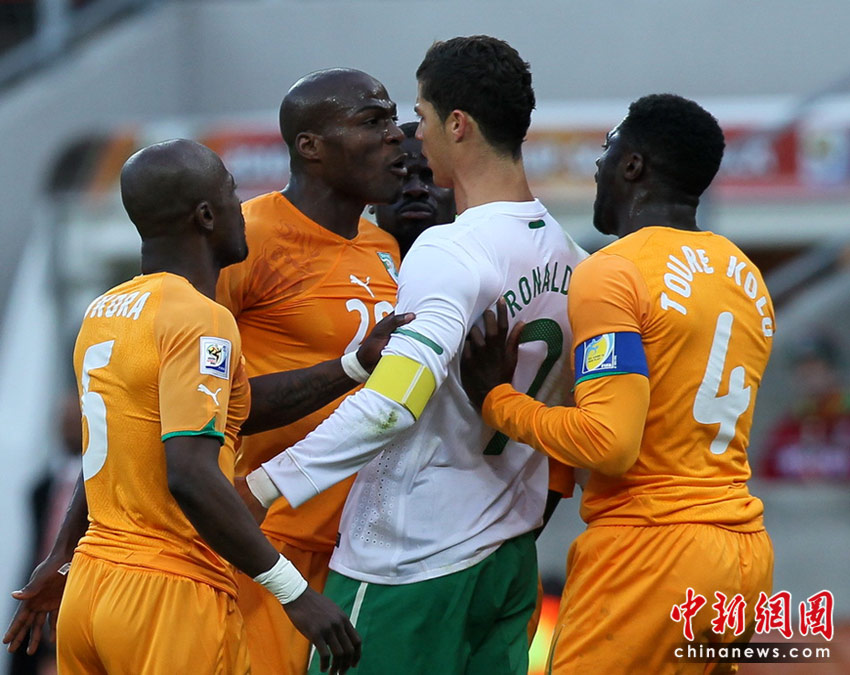 北京時(shí)間6月15日晚22點(diǎn),第19屆世界杯小組賽G組打響首輪爭(zhēng)奪。科特迪瓦隊(duì)在伊麗莎白港的納爾遜-曼德拉灣球場(chǎng)迎戰(zhàn)歐洲勁旅葡萄牙隊(duì)。C·羅上半場(chǎng)擊中門柱成為本場(chǎng)比賽唯一亮點(diǎn),科特迪瓦“魔獸”德羅巴未首發(fā)、。直到比賽進(jìn)行到65分鐘,德羅巴才被替換上場(chǎng)。最終經(jīng)過90分鐘悶戰(zhàn),兩隊(duì)0-0握手言和。