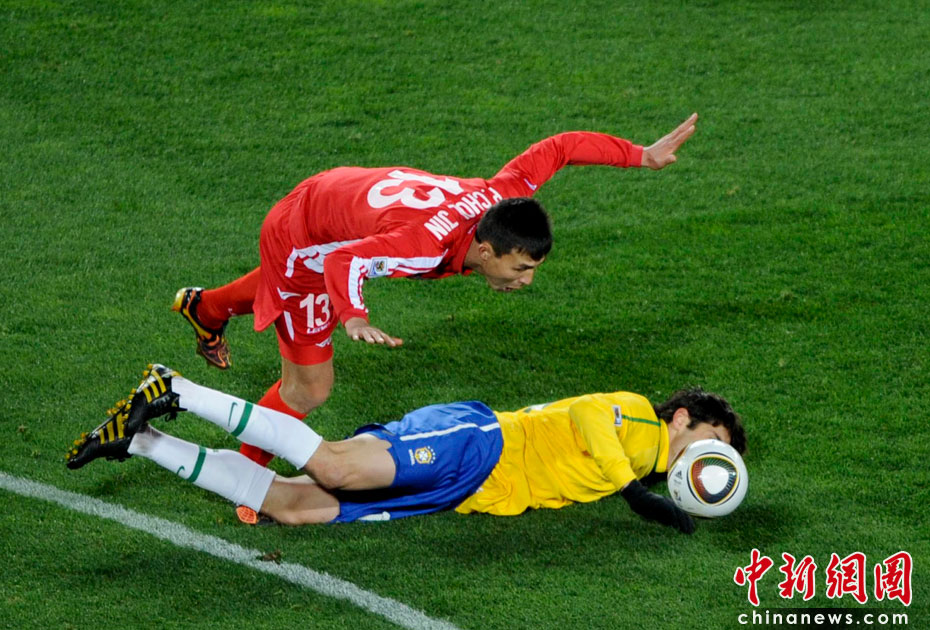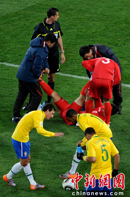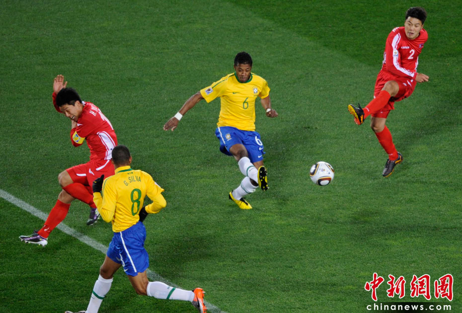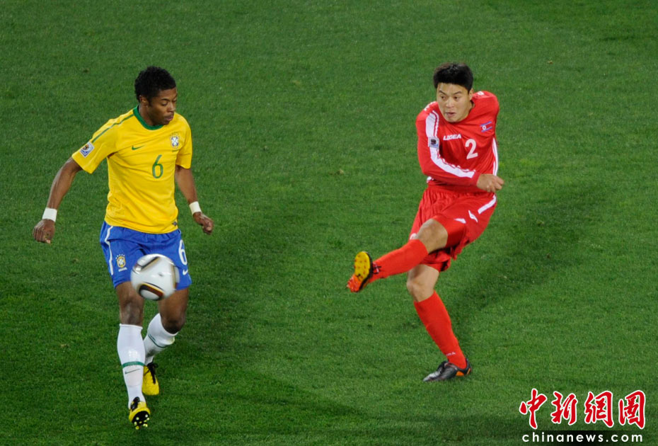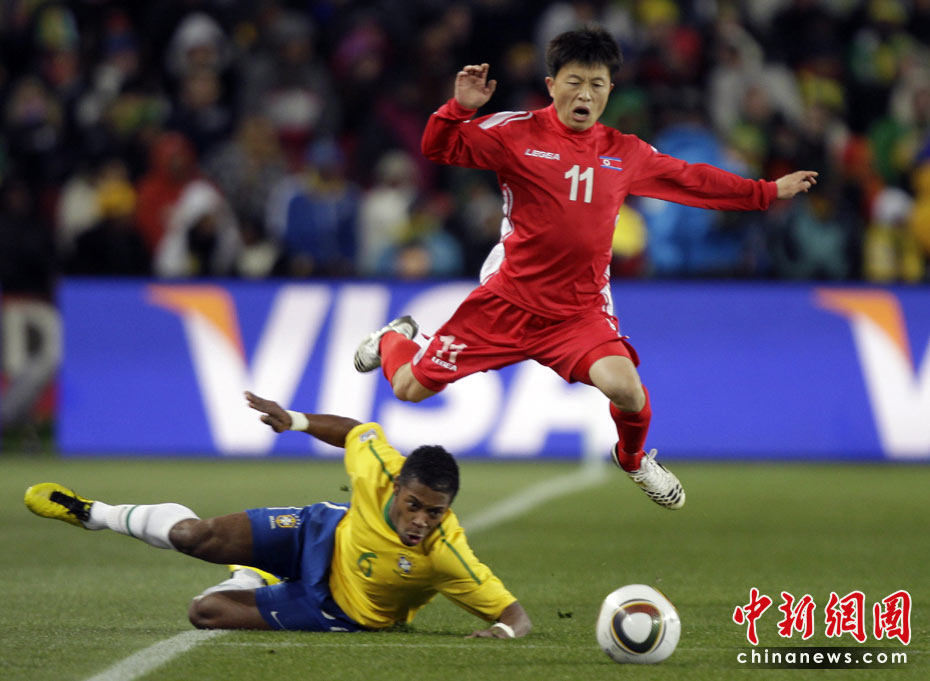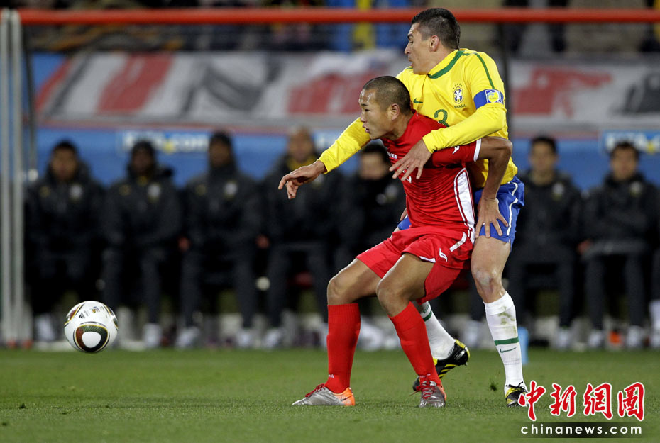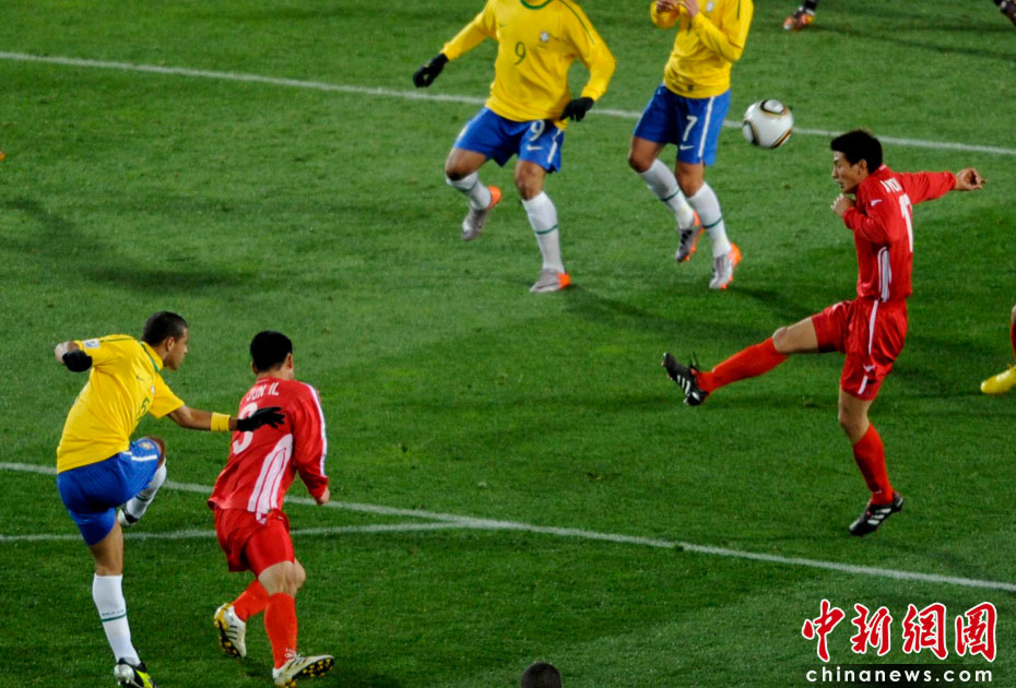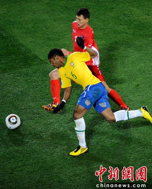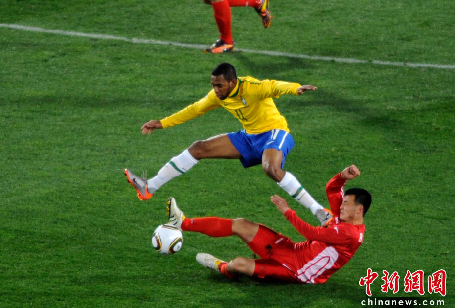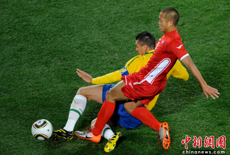 北京時間6月16日凌晨2:30進行的一場世界杯小組賽G組的較量中,巴西隊迎來了朝鮮隊。最終經(jīng)過90分鐘激戰(zhàn),巴西隊2-1擊敗朝鮮,贏得南非世界杯開門紅。中新社記者 廖攀 攝