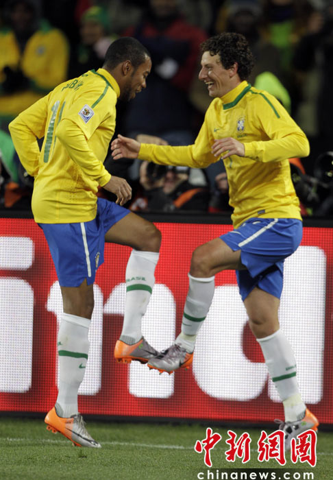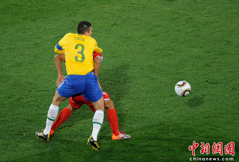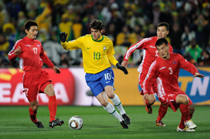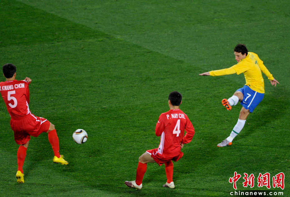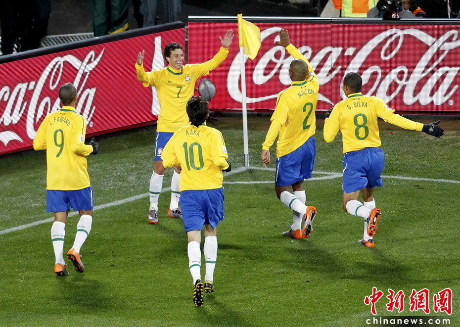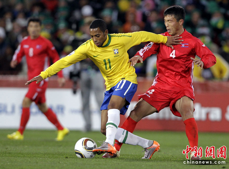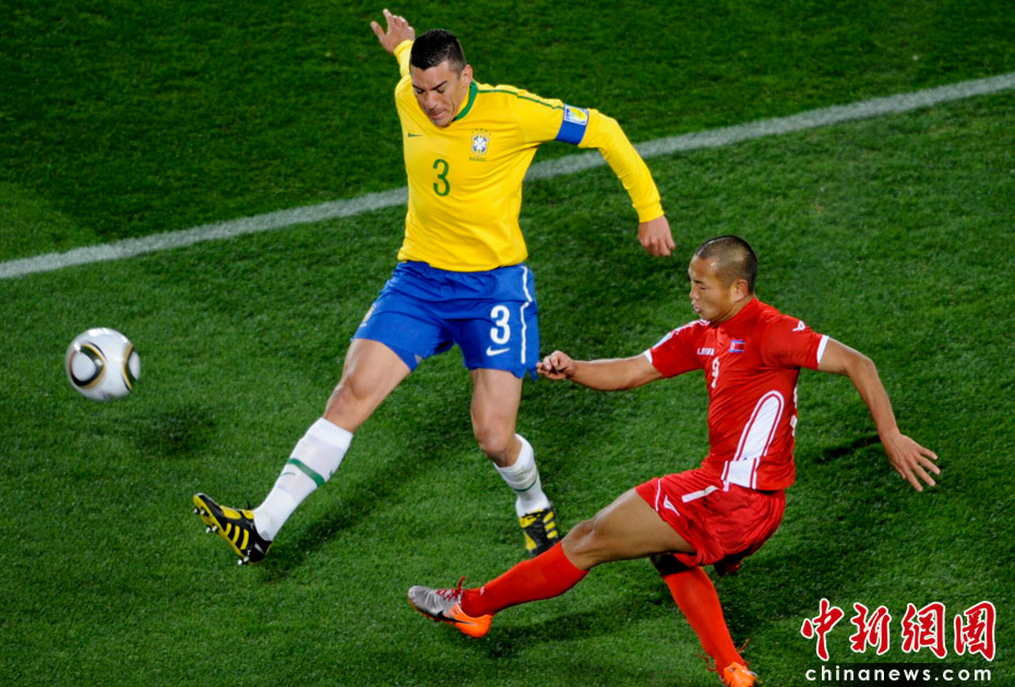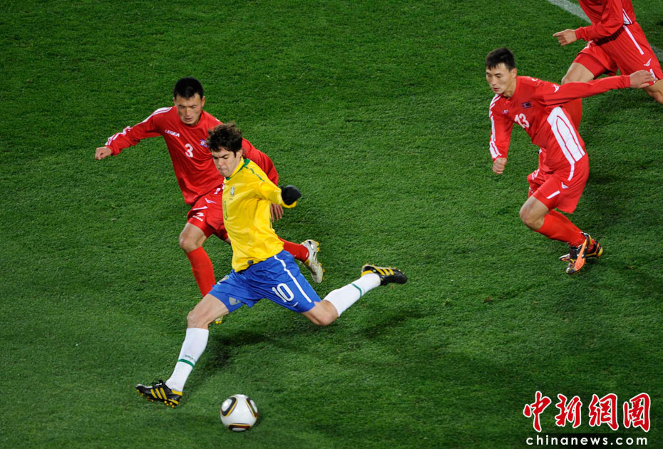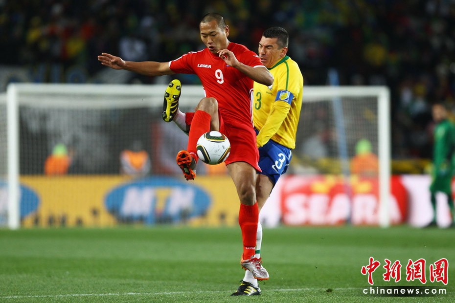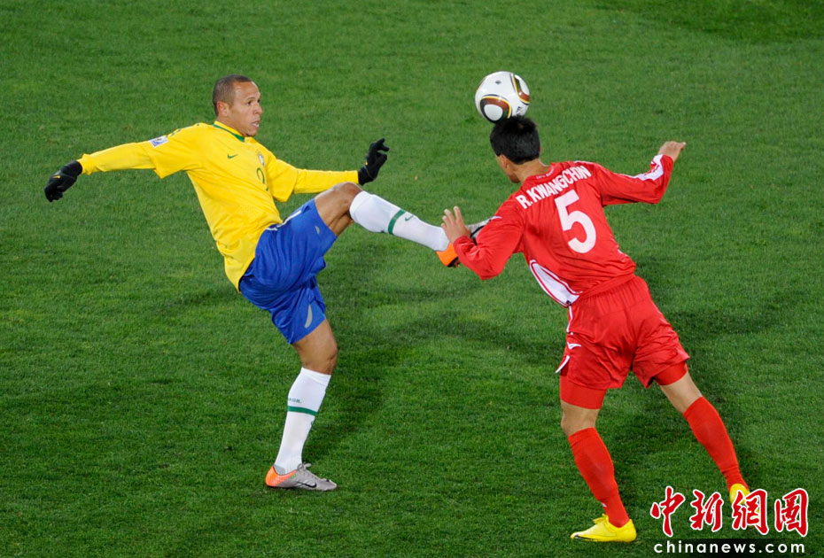 北京時間6月16日凌晨2:30進行的一場世界杯小組賽G組的較量中,巴西隊迎來了朝鮮隊。最終經(jīng)過90分鐘激戰(zhàn),巴西隊2-1擊敗朝鮮,贏得南非世界杯開門紅。中新社記者 廖攀 攝
