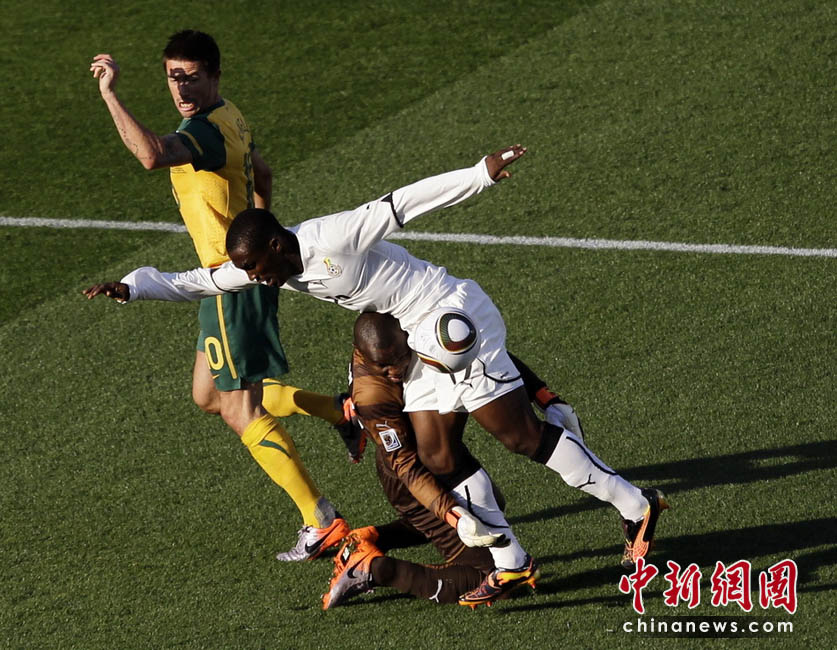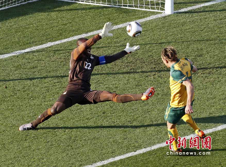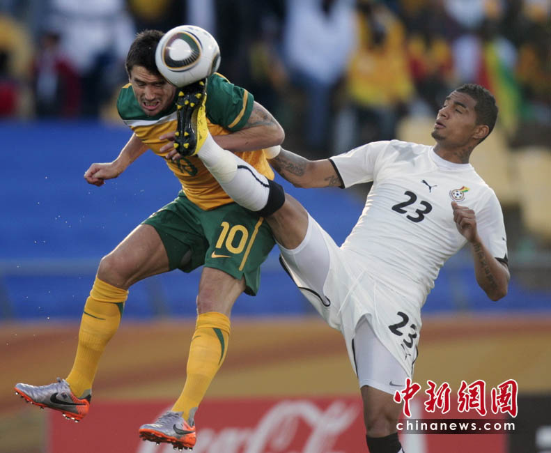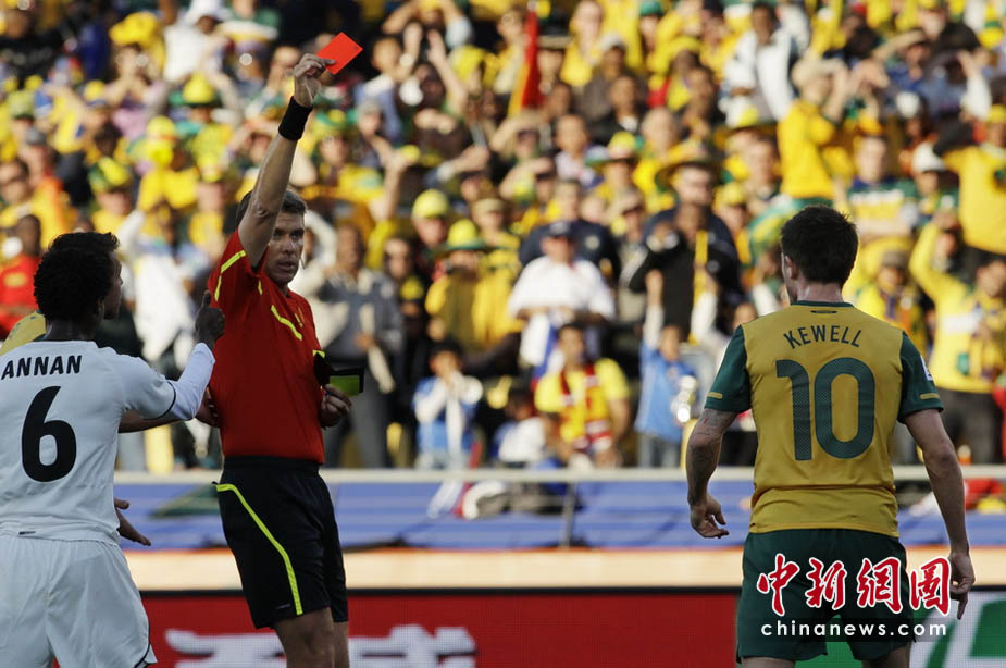 6月19日,世界杯D組第2輪一場(chǎng)小組賽在勒斯騰堡的皇家班佛肯球場(chǎng)展開,加納隊(duì)迎戰(zhàn)澳大利亞隊(duì)。最終被罰下一人的澳大利亞隊(duì)1比1逼平加納。