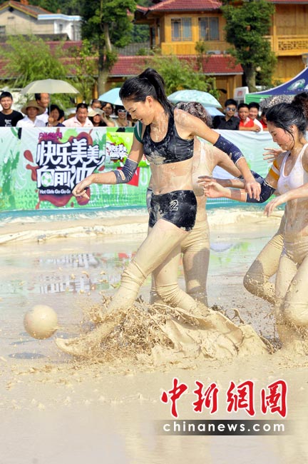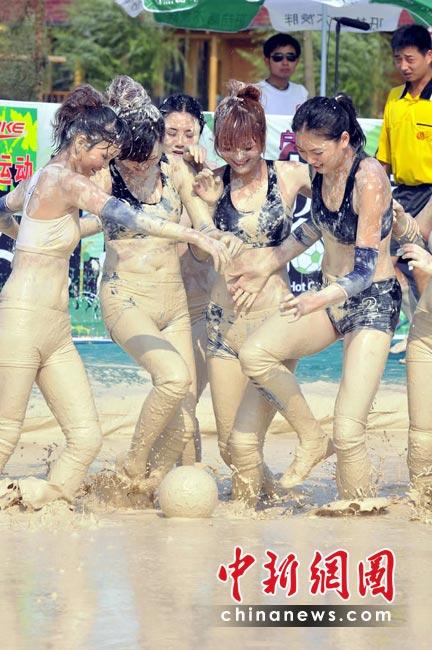 南非世界杯戰(zhàn)火越燃越烈,各地的世界杯熱潮也席卷而來(lái)。近日,一檔比基尼美女足球賽在長(zhǎng)沙開鑼,和世界杯男足不同的是,美女們是在泥漿中比賽。據(jù)悉,這檔名為《快樂美美向前沖》的足球賽已在湖南經(jīng)視播出。節(jié)目中,為了順利闖關(guān),眾美女不顧形象,在泥漿中匍匐前進(jìn)和翻滾,引得觀眾爆笑如雷。圖為首場(chǎng)比賽中,湖南隊(duì)美女與湖北隊(duì)美女在連闖四關(guān)后,進(jìn)入泥漿場(chǎng)內(nèi)進(jìn)行終極球賽PK。湖南經(jīng)視供圖