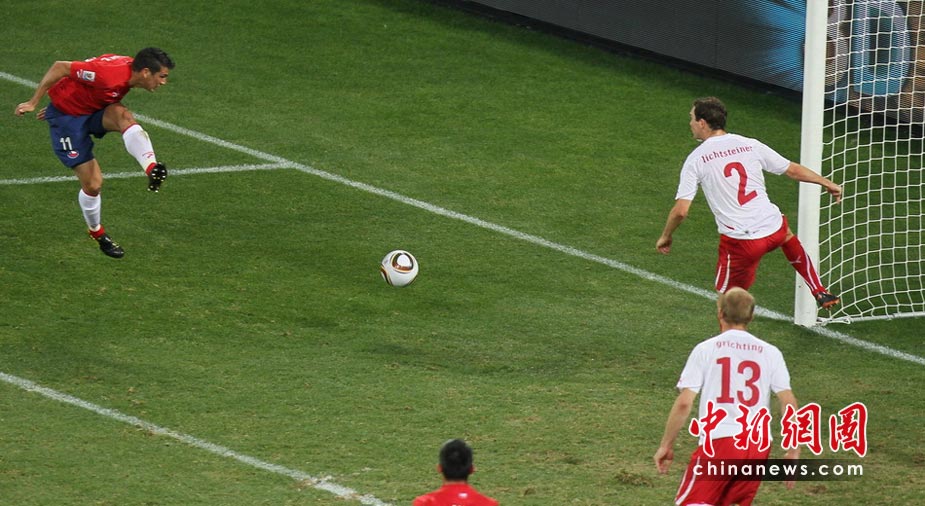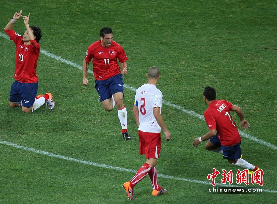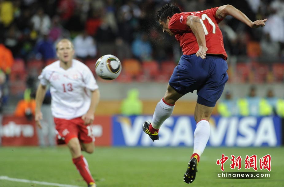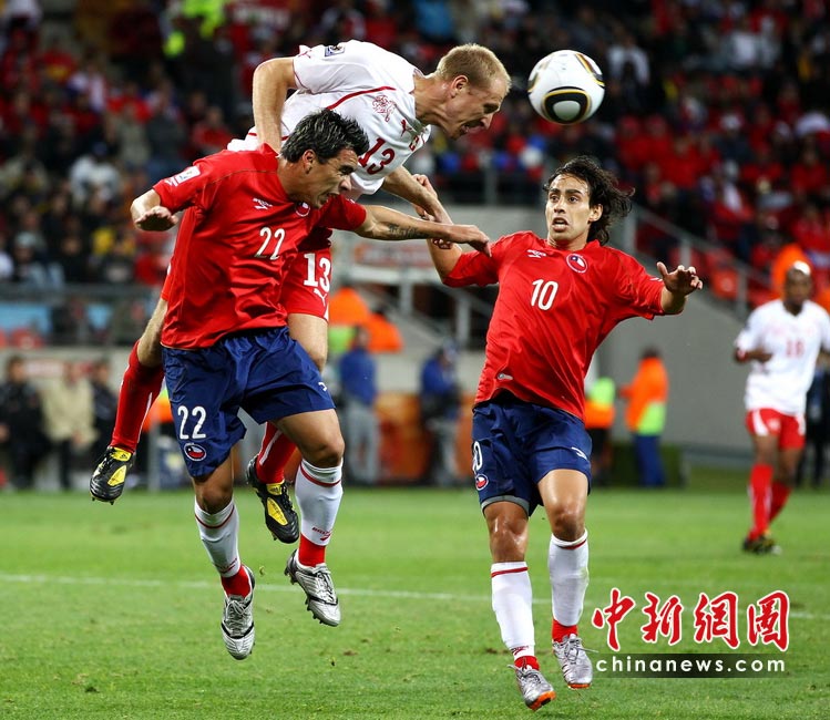 6月21日,世界杯H組第2輪首戰(zhàn)在伊麗莎白港納爾遜-曼德拉灣球場展開較量。瑞士中場貝赫拉米連續(xù)肘擊兩人,被紅牌罰下后,以十人應(yīng)戰(zhàn)的他們在下半場被智利隊岡薩雷斯打入一球,以0-1告負(fù)。