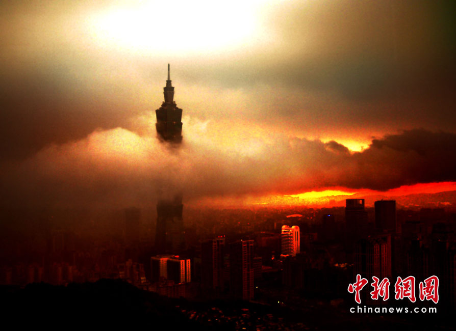 6月28日傍晚,臺北市一陣大雨后,從象山俯瞰市區(qū),101摩天大樓聳入云霄,后山紅云如火,景觀如畫。美麗的臺北市地處盆地,氣候多變,夏季的城市景色也時常變幻莫測。中新社記者 宋吉河攝