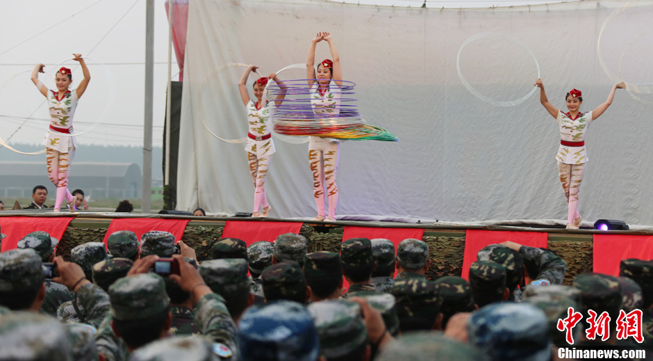 8月10日,隨同中方參演部隊(duì)赴俄羅斯參加“和平使命-2013”中俄聯(lián)演的沈陽軍區(qū)政治部文工團(tuán)演員們,為中俄千余名參演官兵獻(xiàn)上了一場精彩的文藝晚會。豐富多彩的文藝節(jié)目,將位于切巴爾庫爾訓(xùn)練場的中俄聯(lián)演野營村,變成了友誼的盛會、歡樂的海洋。圖為魔術(shù)《流光溢彩》。中新社發(fā) 李祥輝 攝