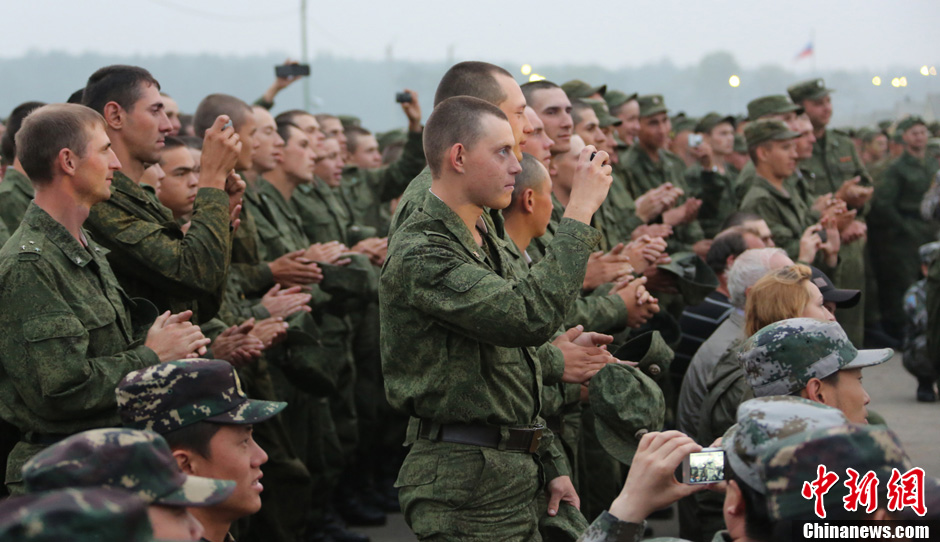 8月10日,隨同中方參演部隊赴俄羅斯參加“和平使命-2013”中俄聯(lián)演的沈陽軍區(qū)政治部文工團演員們,為中俄千余名參演官兵獻(xiàn)上了一場精彩的文藝晚會。豐富多彩的文藝節(jié)目,將位于切巴爾庫爾訓(xùn)練場的中俄聯(lián)演野營村,變成了友誼的盛會、歡樂的海洋。圖為精彩節(jié)目吸引俄國官兵。中新社發(fā) 李祥輝 攝