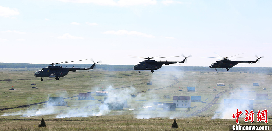 8月12日,“和平使命-2013”聯(lián)合反恐軍演中俄兩軍參演部隊(duì)在切巴爾庫(kù)爾合同訓(xùn)練場(chǎng)舉行全員全要素實(shí)兵協(xié)同訓(xùn)練。雙方共出動(dòng)官兵近900人,坦克、步戰(zhàn)車、直升機(jī)等武器裝備約130臺(tái),雙方導(dǎo)演部總導(dǎo)演——俄中部軍區(qū)司令員波格諾夫斯基和沈陽(yáng)軍區(qū)副司令員石香元,共同到演習(xí)地觀摩并指導(dǎo)兩軍訓(xùn)練。圖為陸航編隊(duì)實(shí)施空中偵察。中新社發(fā) 李祥輝 攝